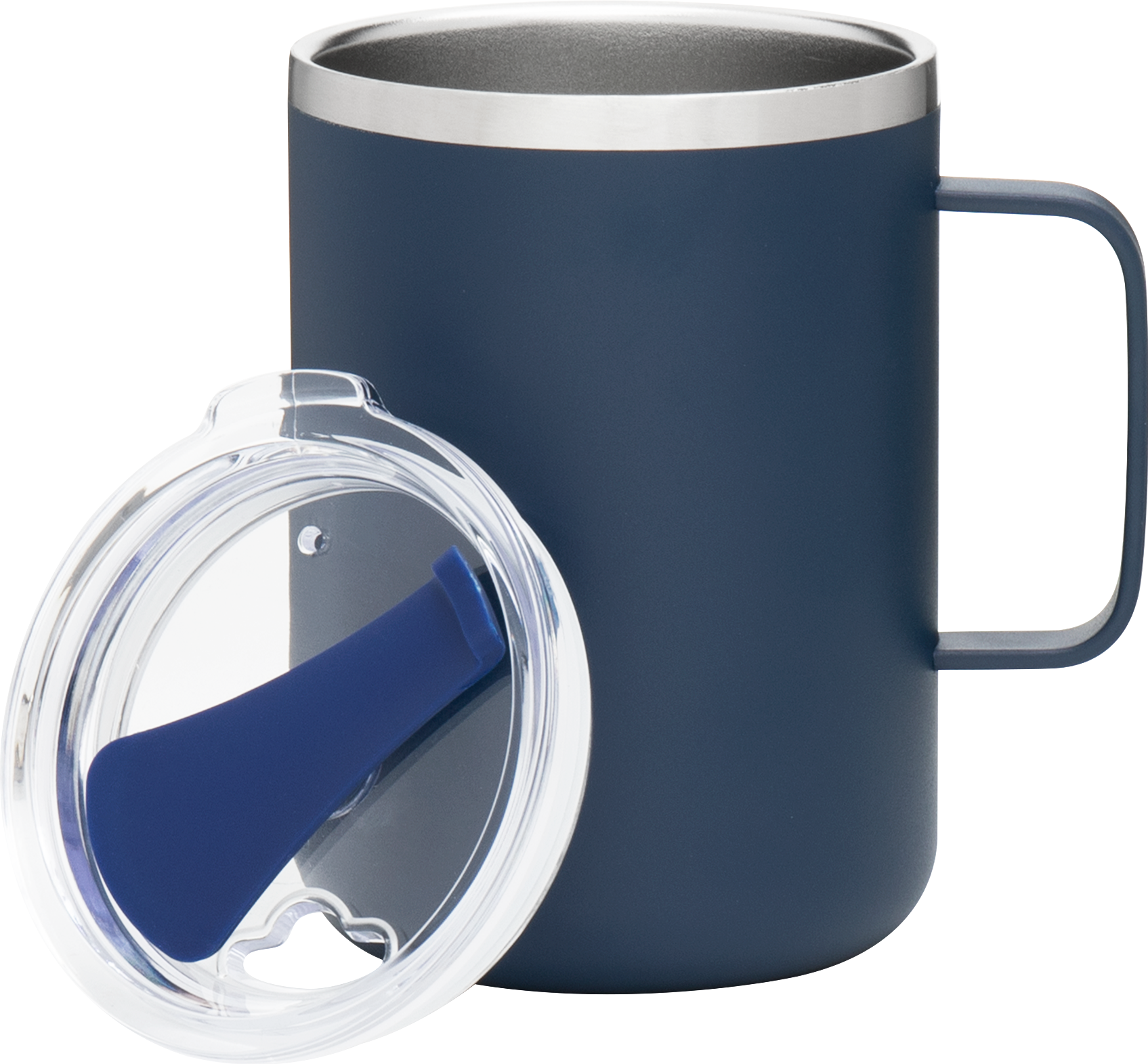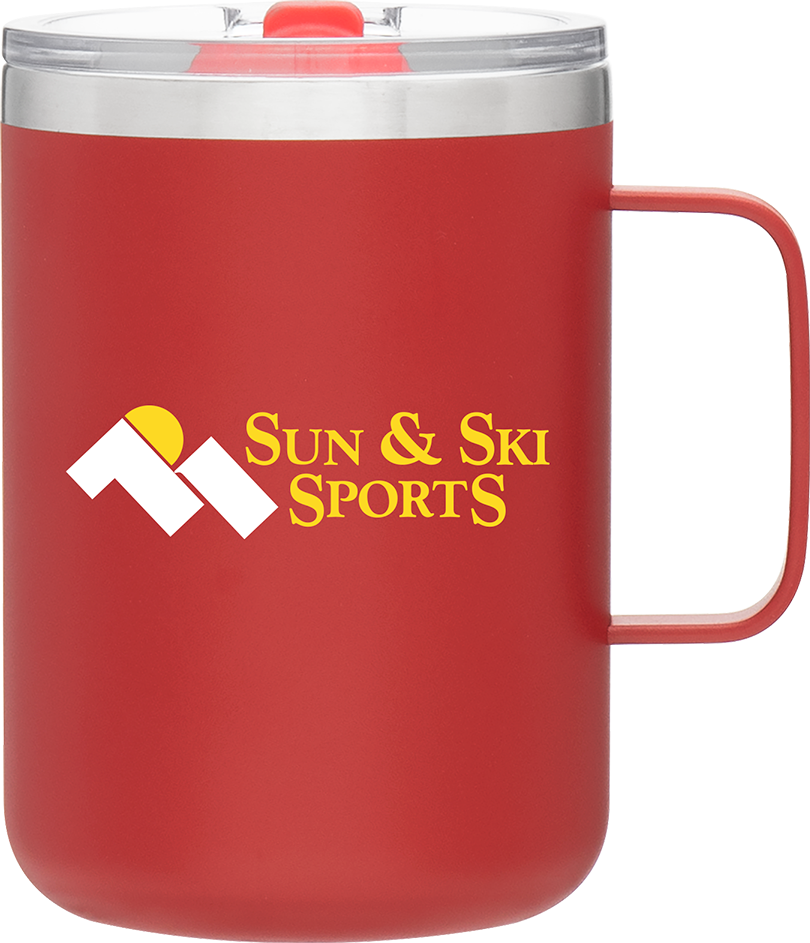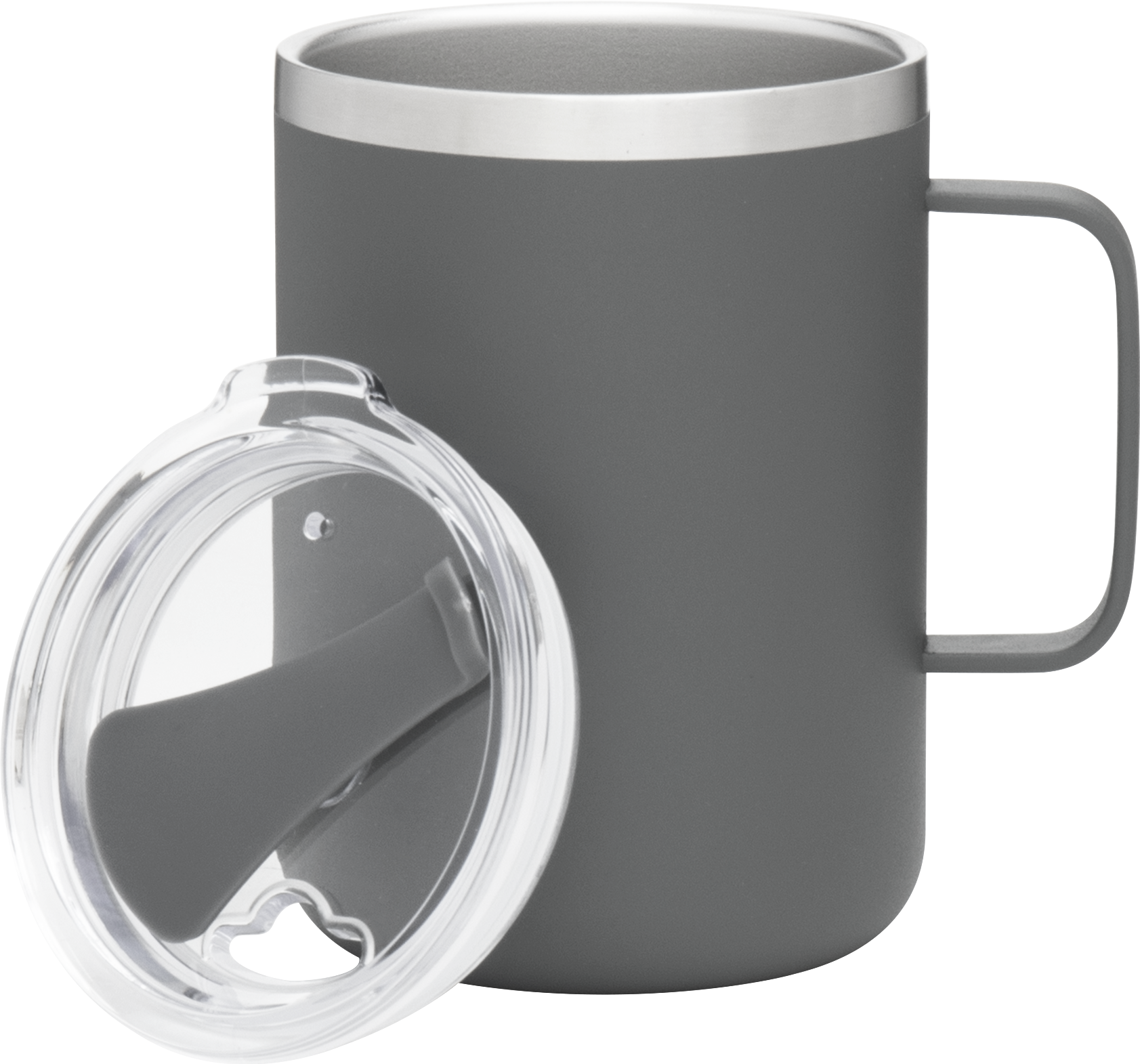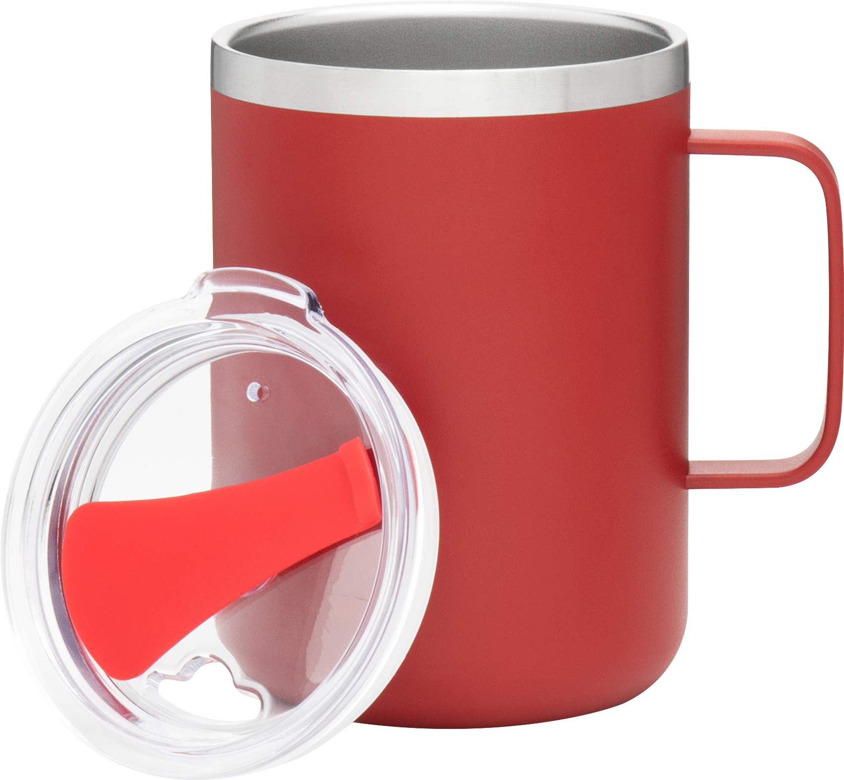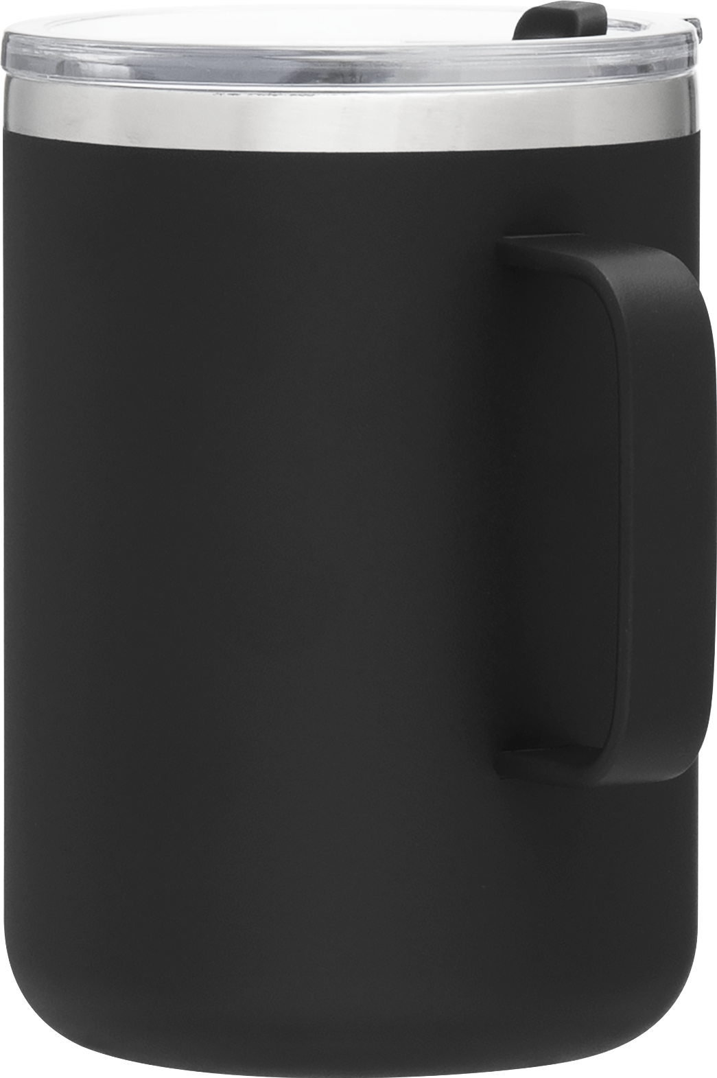 The Camper 16.9 oz thermal mug is designed for outdoor comfort and all-day performance. Made from durable 18/8 stainless steel with double wall construction and copper vacuum insulation, it keeps drinks hot or cold for hours. A clear push-on lid with a matching swivel closure provides spill-resistant sipping, while the stainless steel rim adds a rugged, camp-style detail. Finished with a durable powder coated exterior, it's ready for the trail, the firepit, or your daily commute.