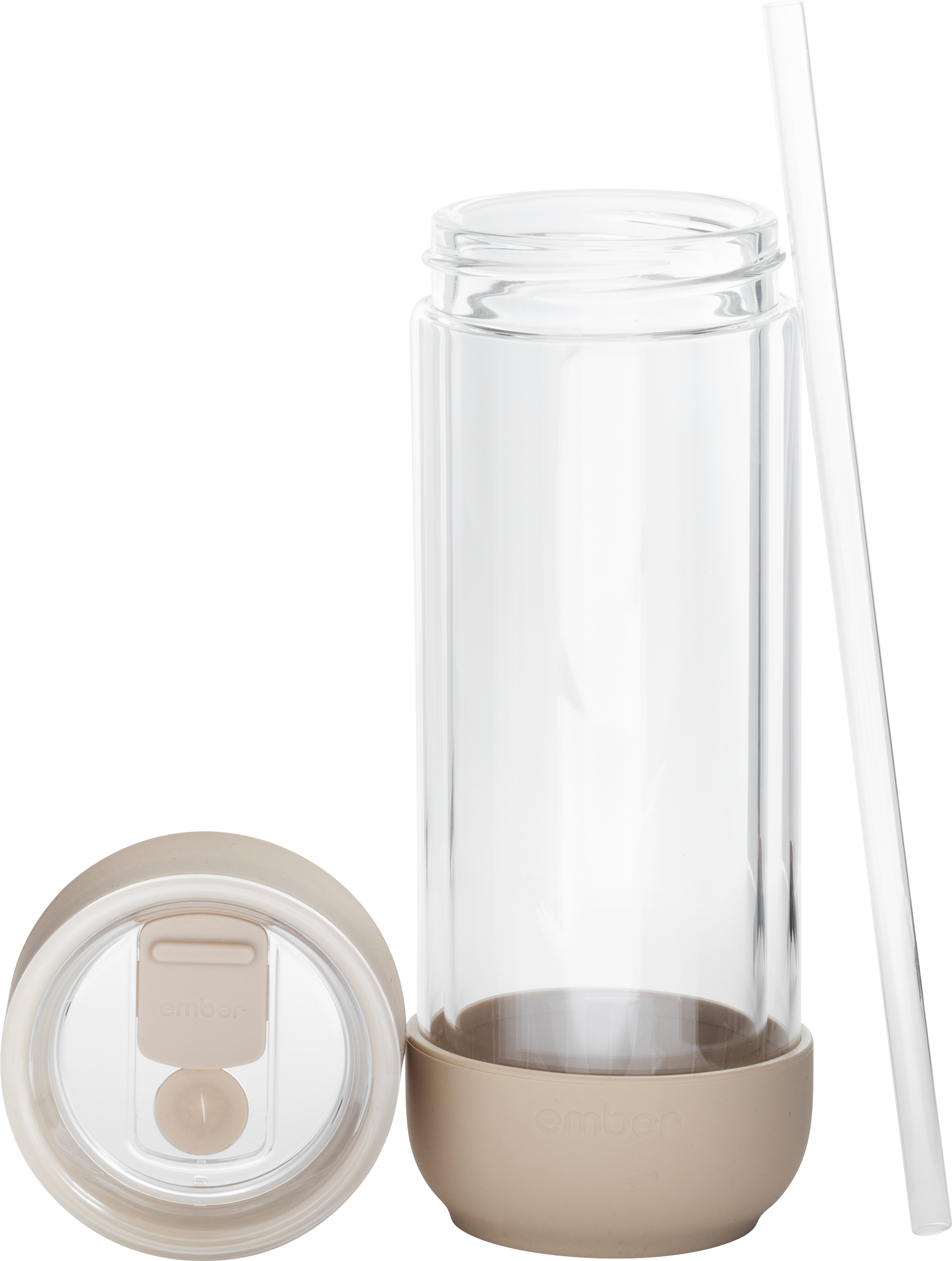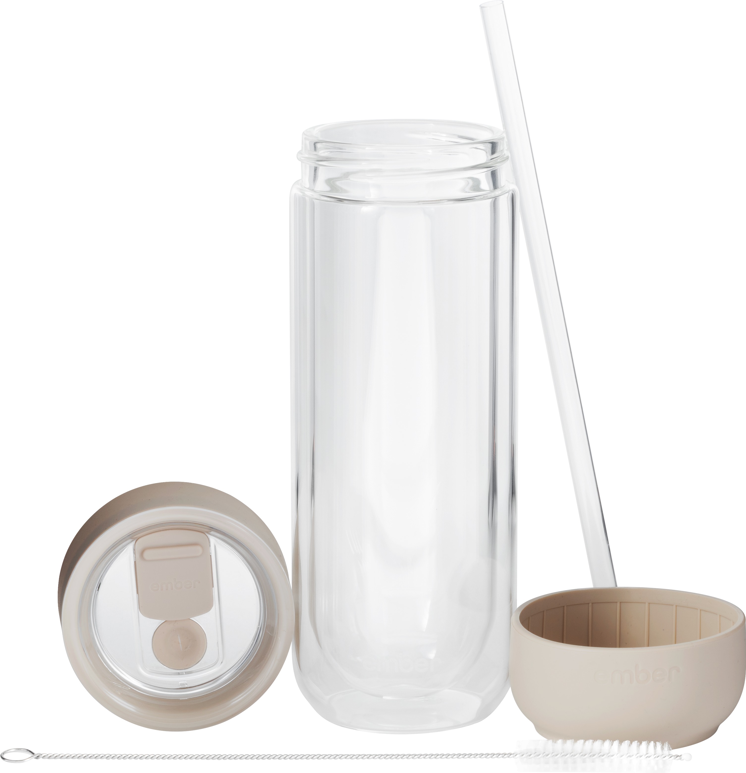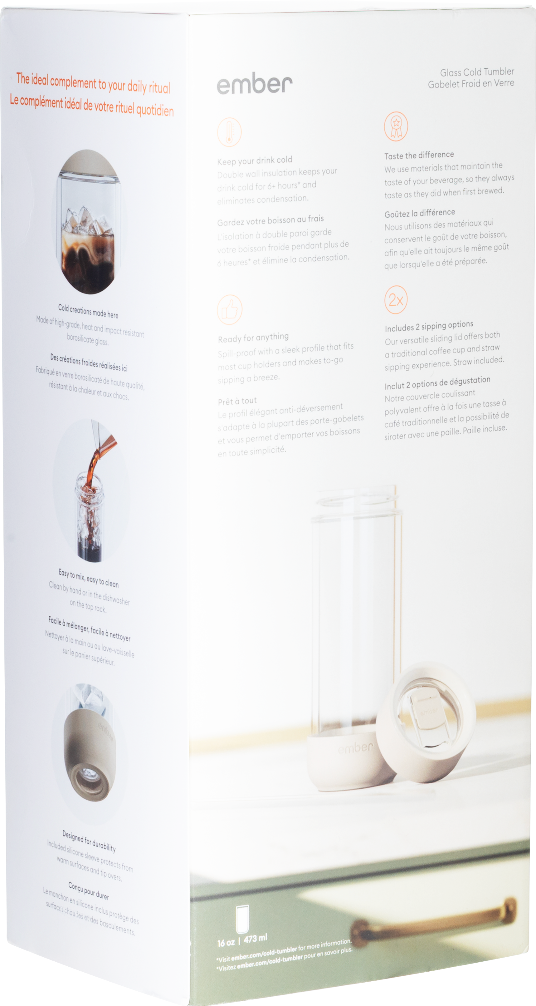 The Ember Cold Tumbler 16 oz is a sleek, double-wall insulated borosilicate glass tumbler designed to keep cold drinks chilled for over 6 hours without condensation. Its temperature-resistant, laboratory-grade glass preserves beverage taste, while the 2-way sliding lid allows for sipping or straw use with the included Tritan™ straw. A soft-touch silicone boot offers grip and cushioning, and the compact profile fits most cup holders. Made from BPA-free materials.