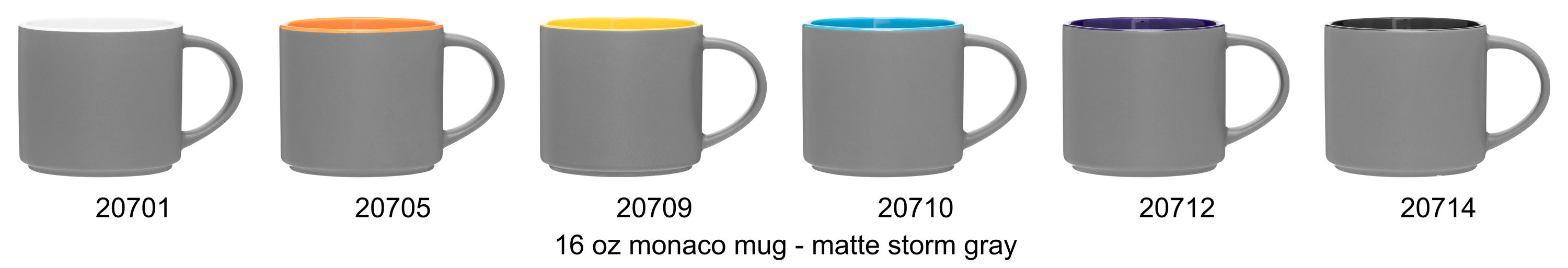 The Monaco 16 oz ceramic mug features modern simplicity with practical design. It has a matte gray exterior paired with a glossy colored interior for a clean, two-tone look. Its stackable shape makes it great for space-saving storage in homes, cafés, or offices—perfect for coffee, tea, or cocoa.