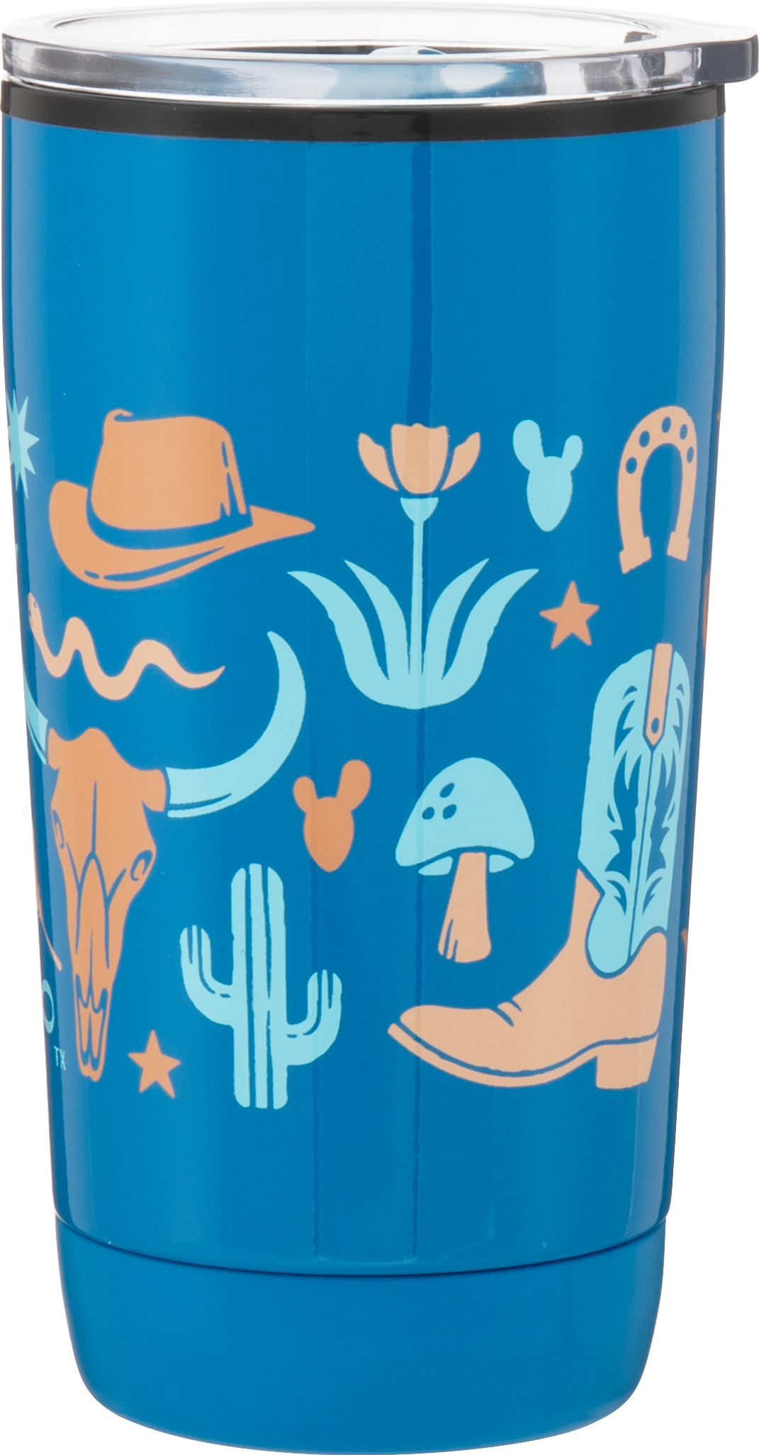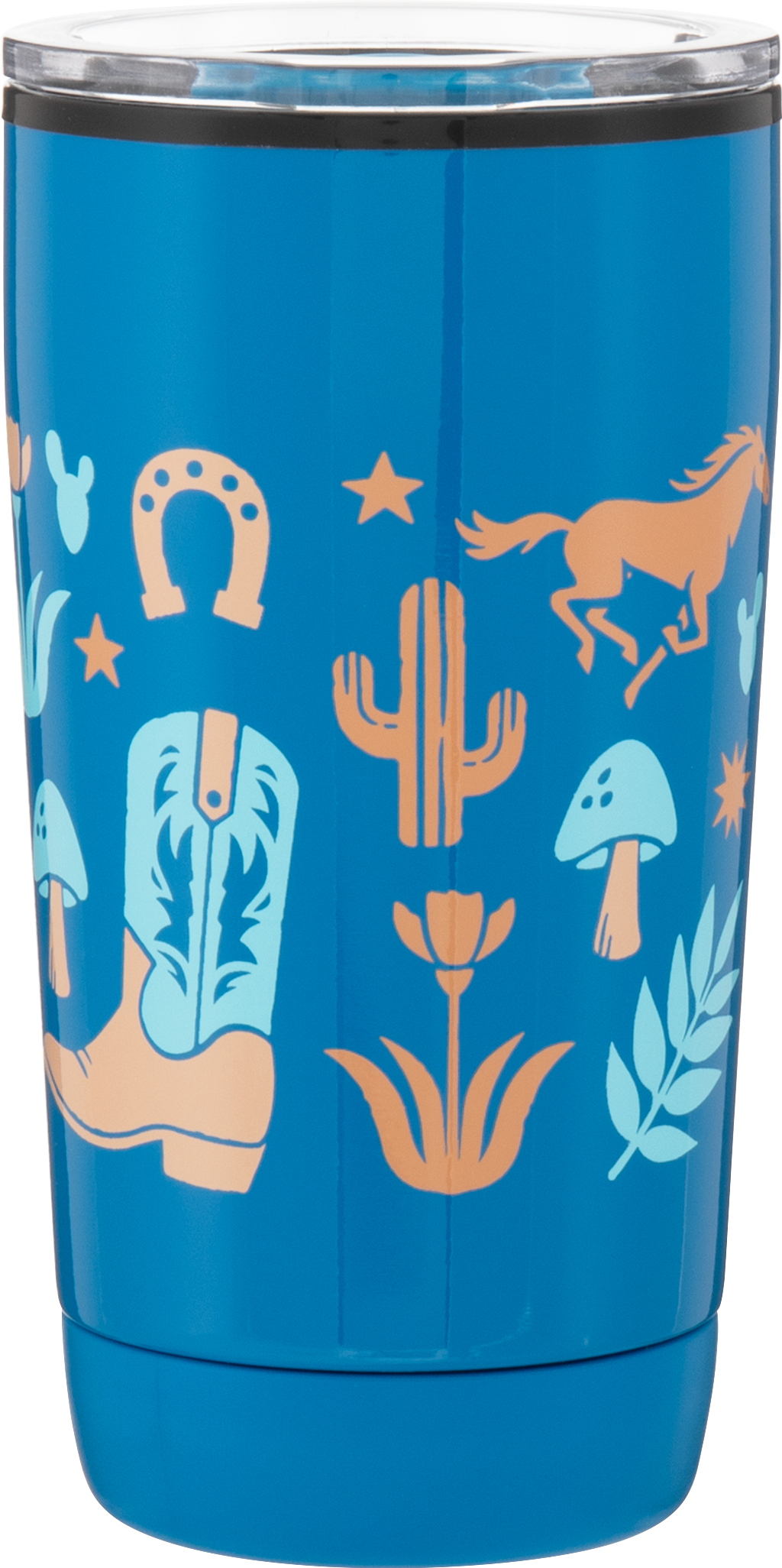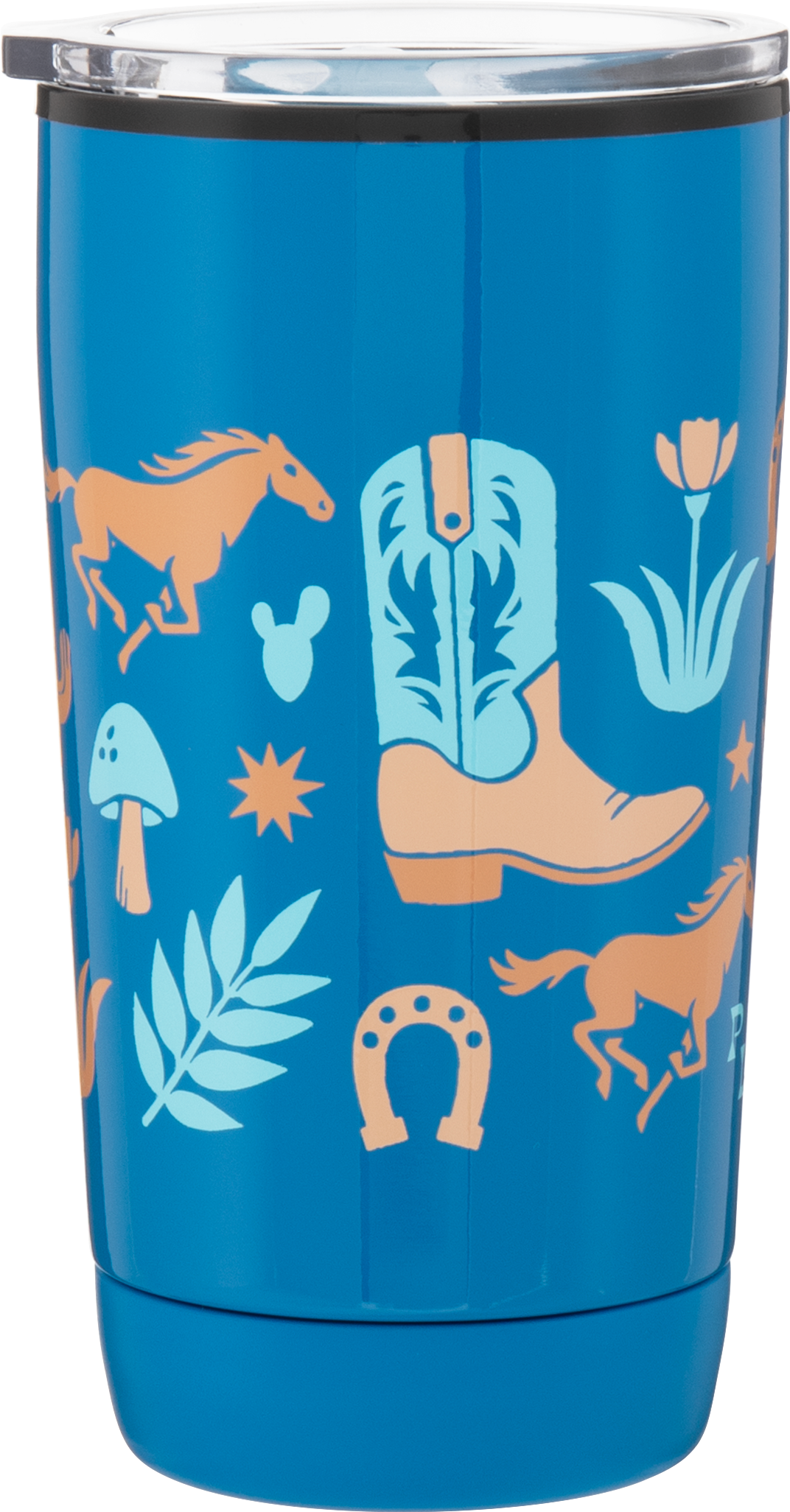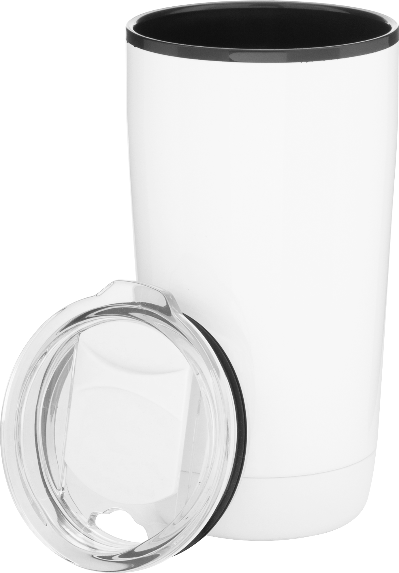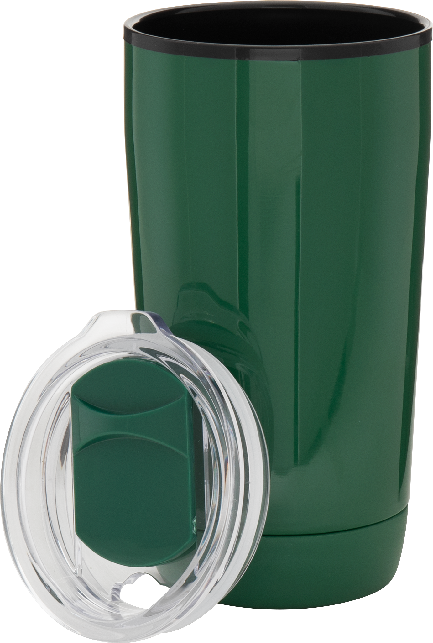 The Plano 16 oz tumbler offers a polished look with practical performance. It features a double wall design with a stainless steel outer wall and a plastic inner wall to help maintain temperature. The clear push-on lid includes a matching sliding closure for easy, splash-resistant sipping. Finished with a glossy exterior and a matte base for added grip and contrast, it's great for coffee, tea, or cold drinks on the go.