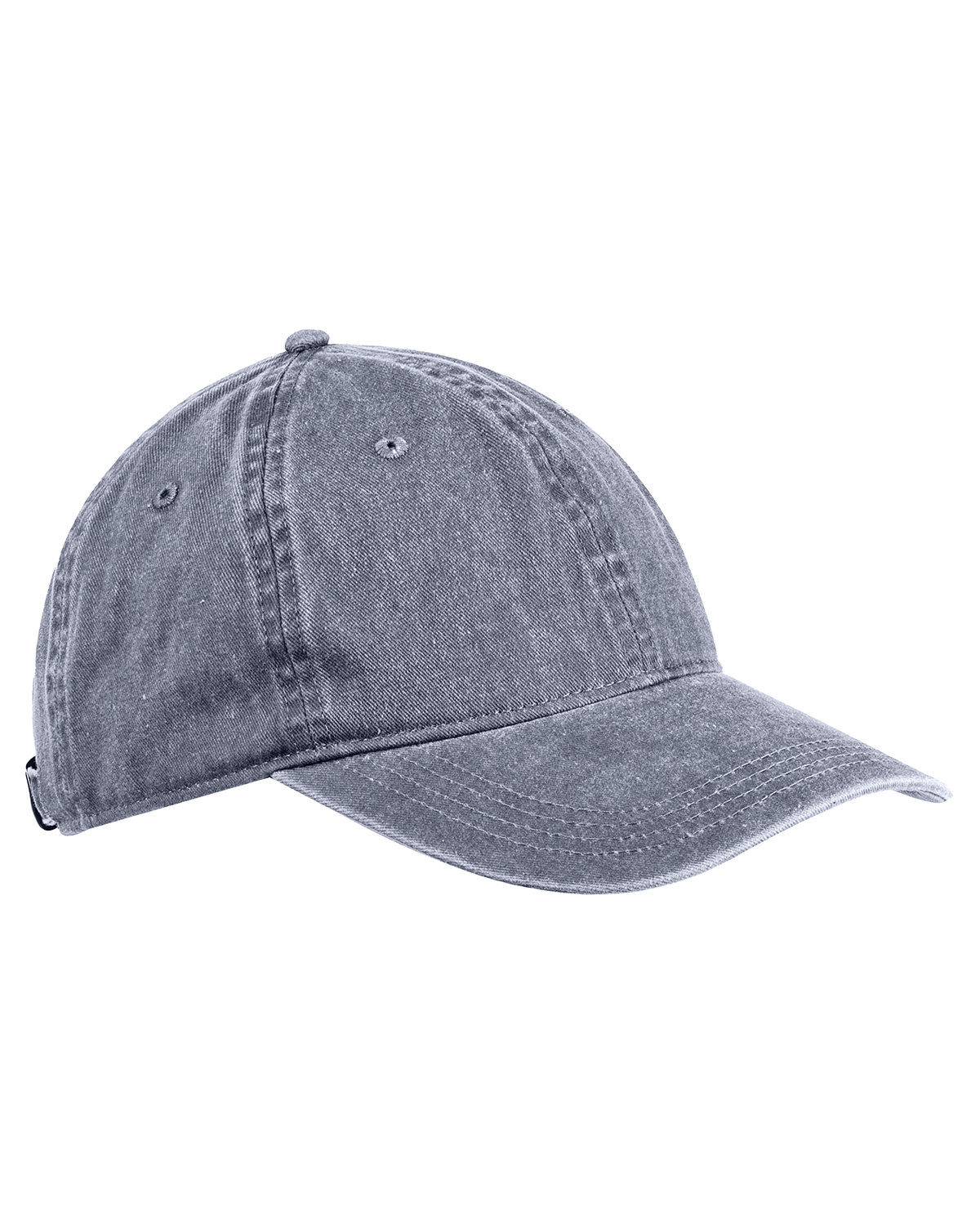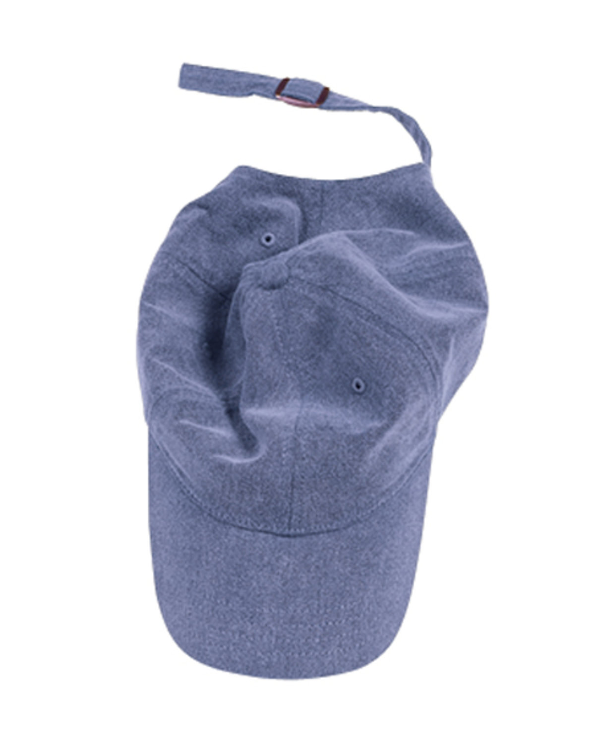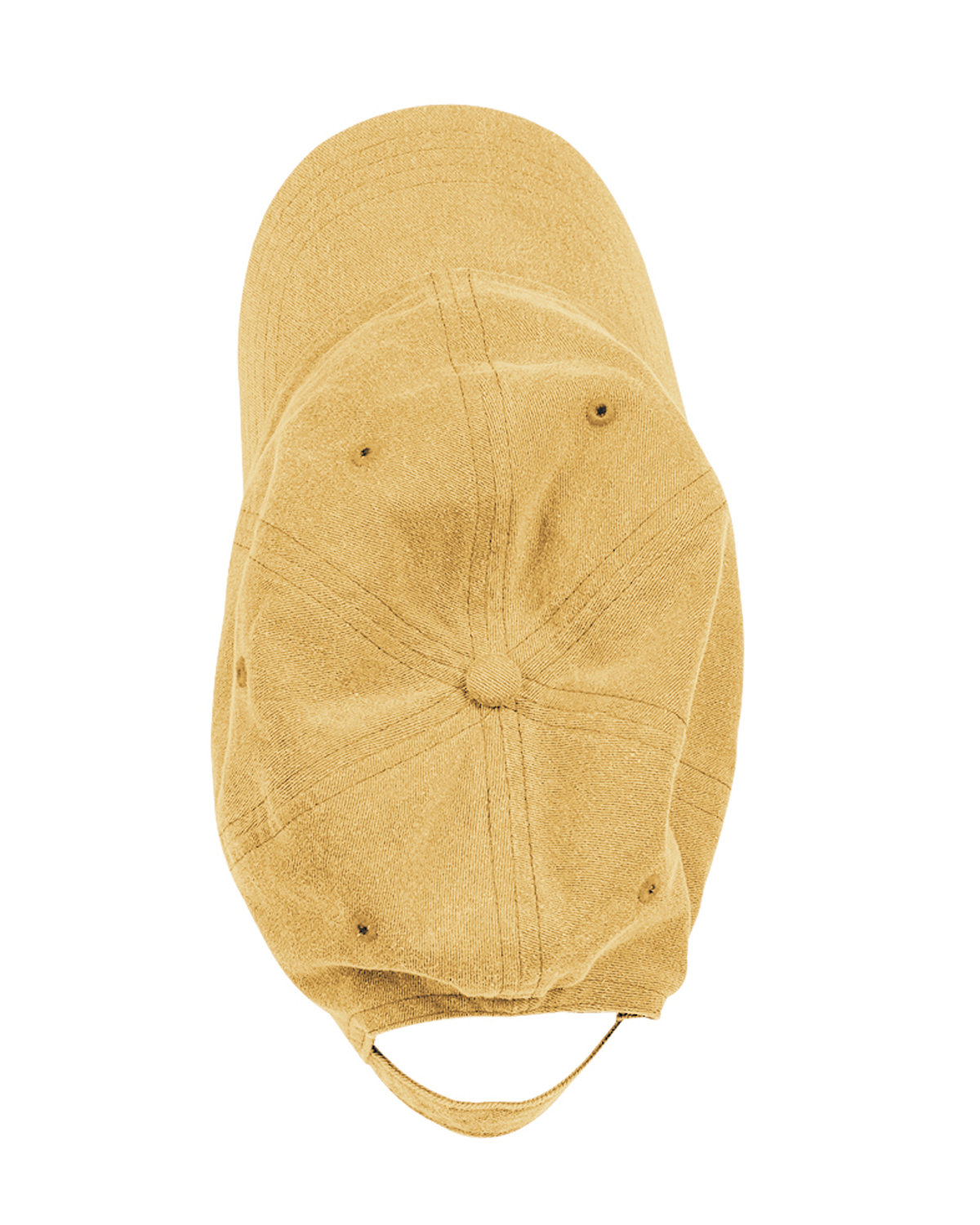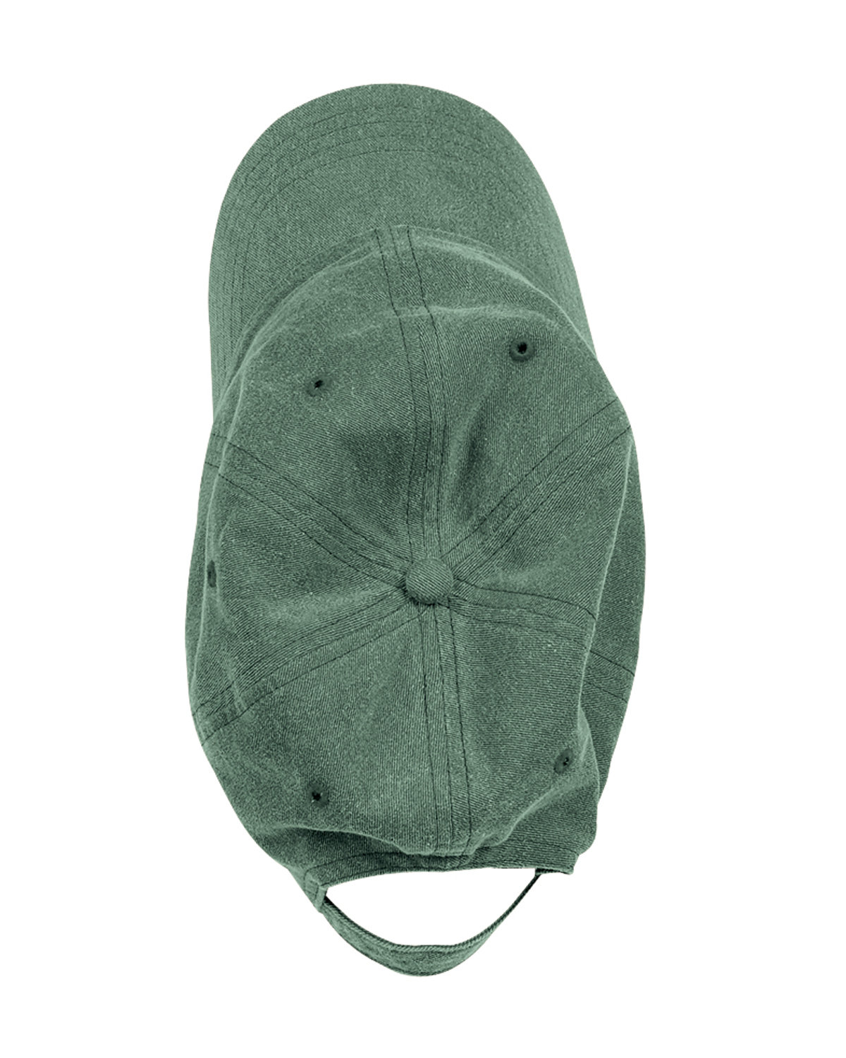 100% pigment-dyed, water-washed cotton twill;6-panel, unstructured; Embroidered eyelets; Contrasting pigment-dyed button and visor on two-toned caps; Antique brass snap with tuck-in closure;
