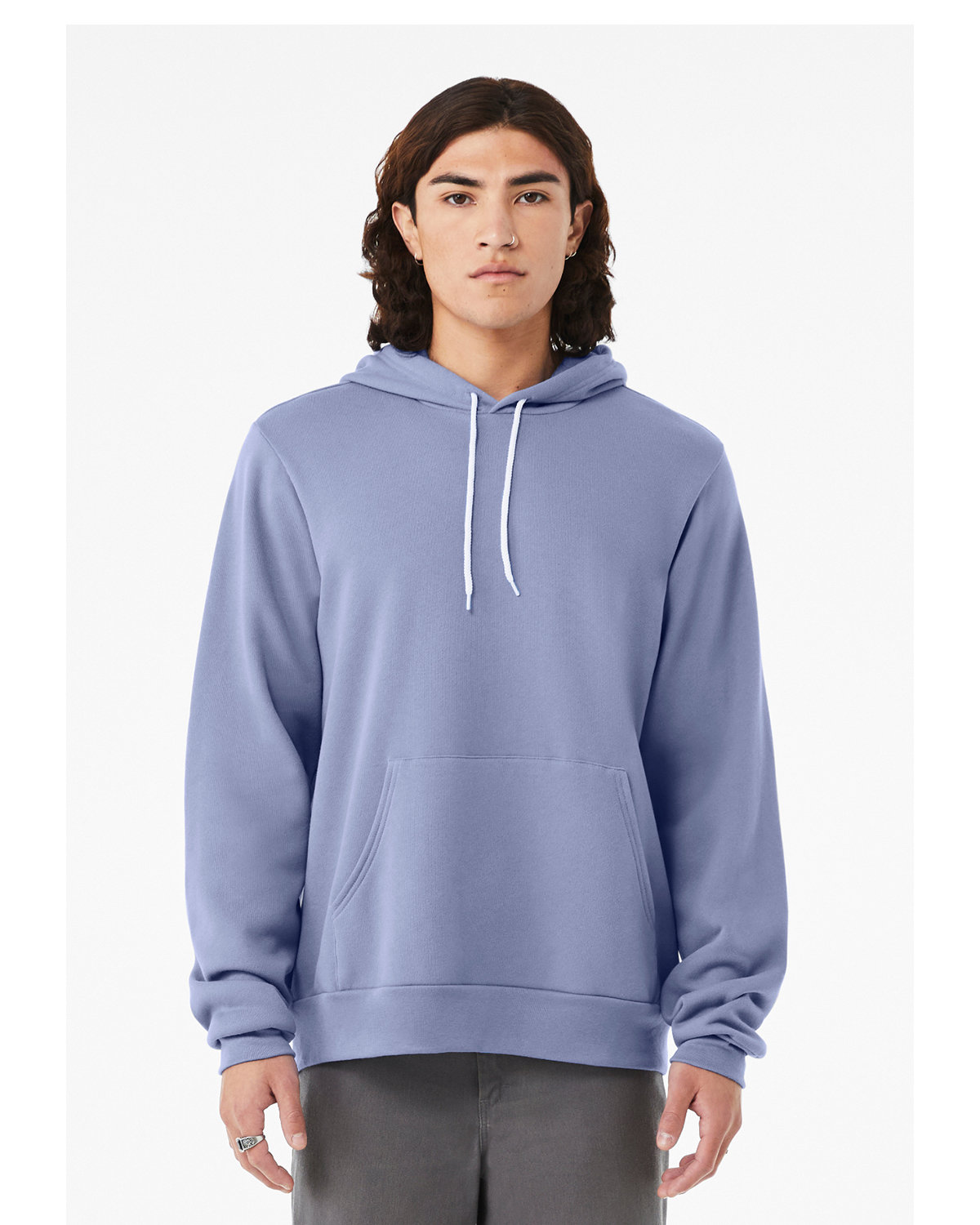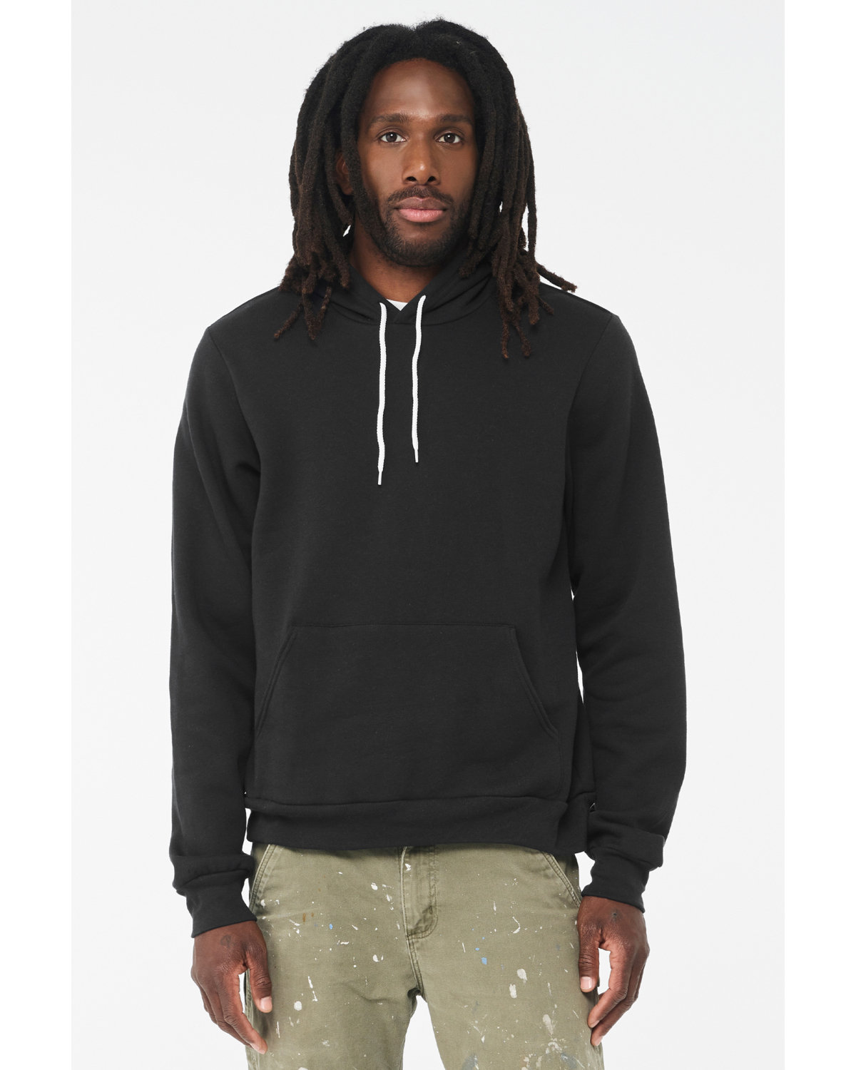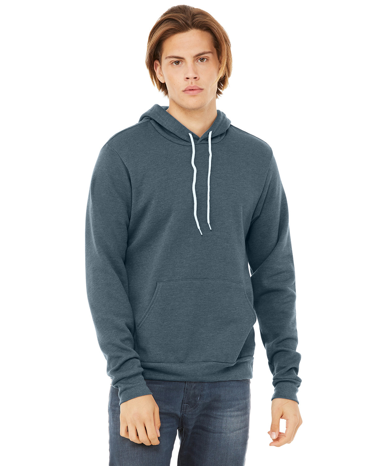 8 oz., 52% Airlume combed and ringspun cotton, 48% polyester fleece; Athletic Heather is 90% combed ringspun cotton, 10% polyester; Marbles: 85% combed ringspun cotton, 15% polyester; Heather Navy is 60% Airlume combed and ringspun cotton, 40% polyester; DTG: direct-to-garment, print friendly; DTG: face is 100% Airlume combed,ring-spun cotton, balance is 70 cot/30 poly;White cord drawstring, unisex sizing, retail fit; Pouch pockets; Ribbed cuffs and waistband; Tear away label; BELLA+CANVAS uses sustainable manufacturing processes with Blue Sign certified dyes, efficient dye houses that adhere to the state of California’s EPA regulations around waste water treatment and usage, and cutting facilities in Los Angeles that run on partial solar power with comprehensive recycling programs for paper waste and fabric scraps.;