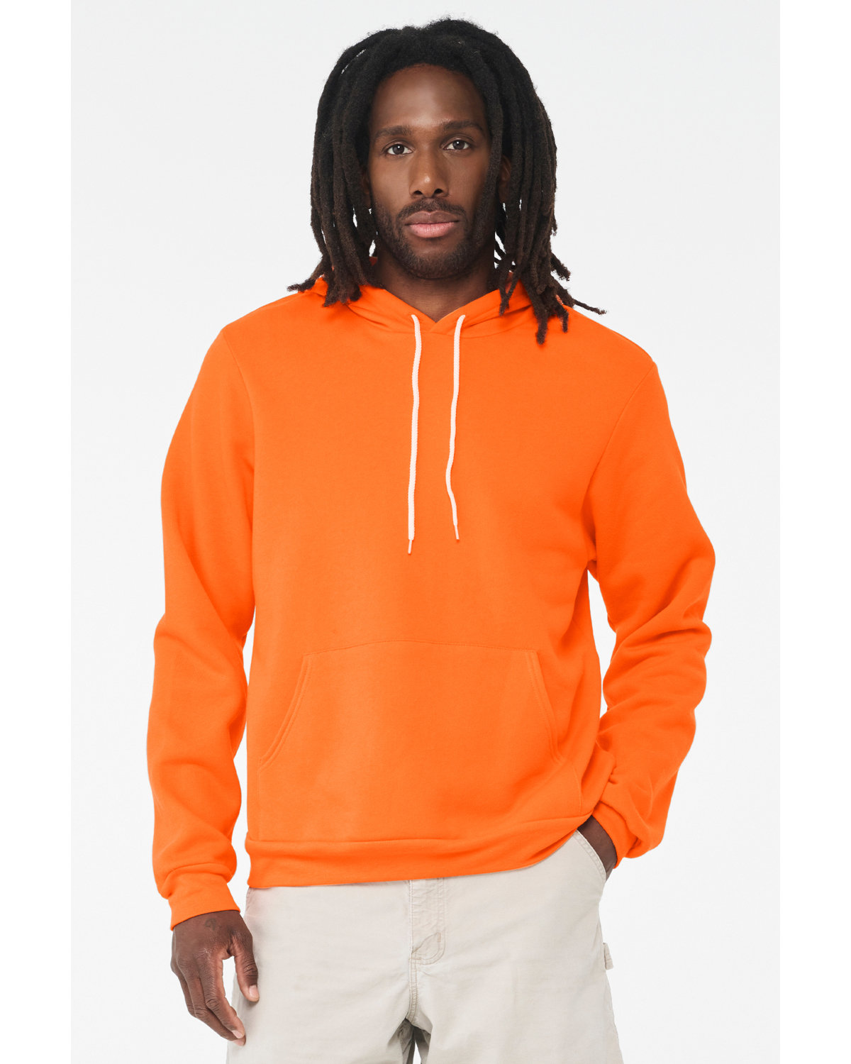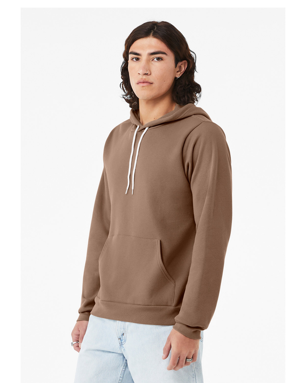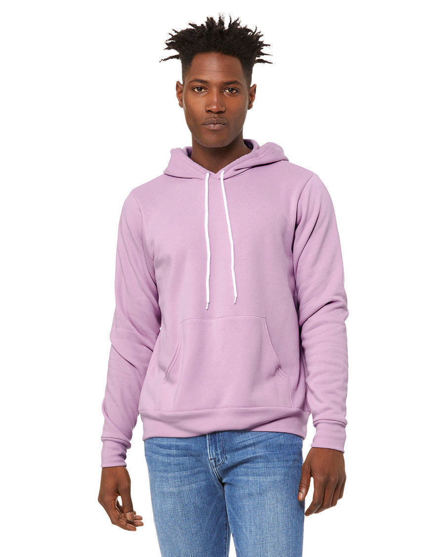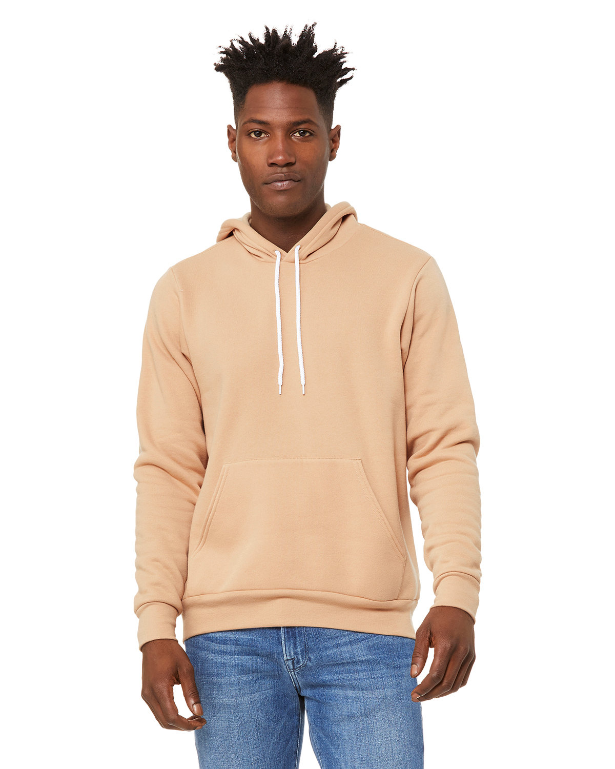 8 oz., 52% Airlume combed and ringspun cotton, 48% polyester fleece; Athletic Heather is 90% combed ringspun cotton, 10% polyester; Marbles: 85% combed ringspun cotton, 15% polyester; Heather Navy is 60% Airlume combed and ringspun cotton, 40% polyester; DTG: direct-to-garment, print friendly; DTG: face is 100% Airlume combed,ring-spun cotton, balance is 70 cot/30 poly;White cord drawstring, unisex sizing, retail fit; Pouch pockets; Ribbed cuffs and waistband; Tear away label; BELLA+CANVAS uses sustainable manufacturing processes with Blue Sign certified dyes, efficient dye houses that adhere to the state of California’s EPA regulations around waste water treatment and usage, and cutting facilities in Los Angeles that run on partial solar power with comprehensive recycling programs for paper waste and fabric scraps.;