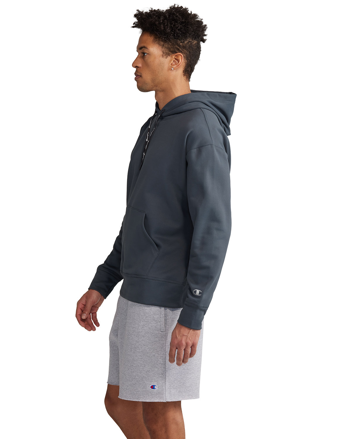 5.5 oz., 95% recycled polyester, 5% spandex;Single-ply hood; Champion logo black drawcord; Pouch pocket; Self-fabric cuffs and waistband; Champion "C" patch on left sleeve; Triple needle stitch details at cuffs, waistband and hood; Heat sealed neck label; “A-” list status from CDP (Carbon Disclosure Project) ; Energy Star Partner of the Year (14 consecutive years); Every piece of Champion apparel purchased qualifies for Hanes4Education;