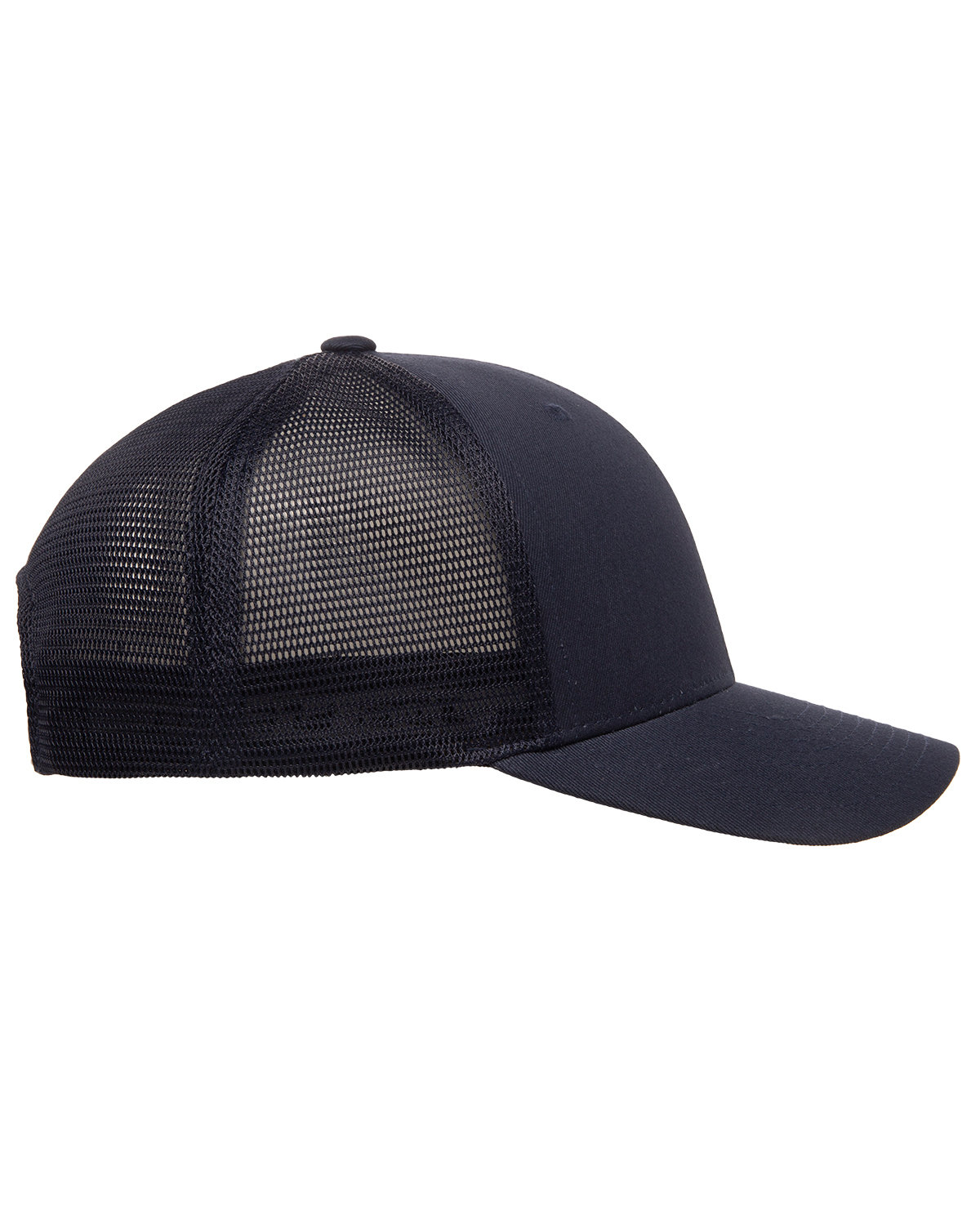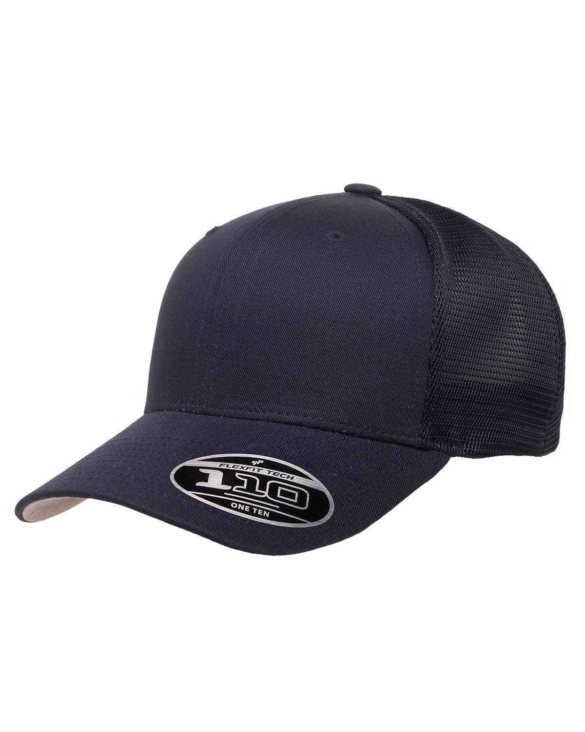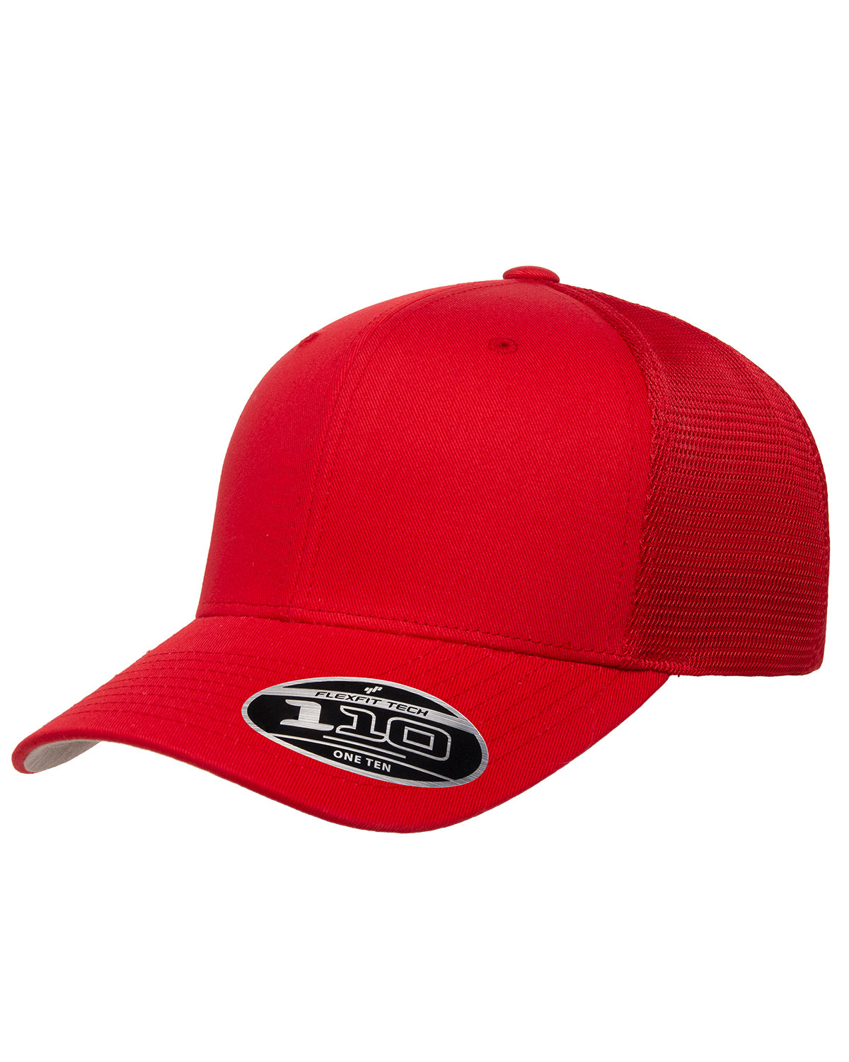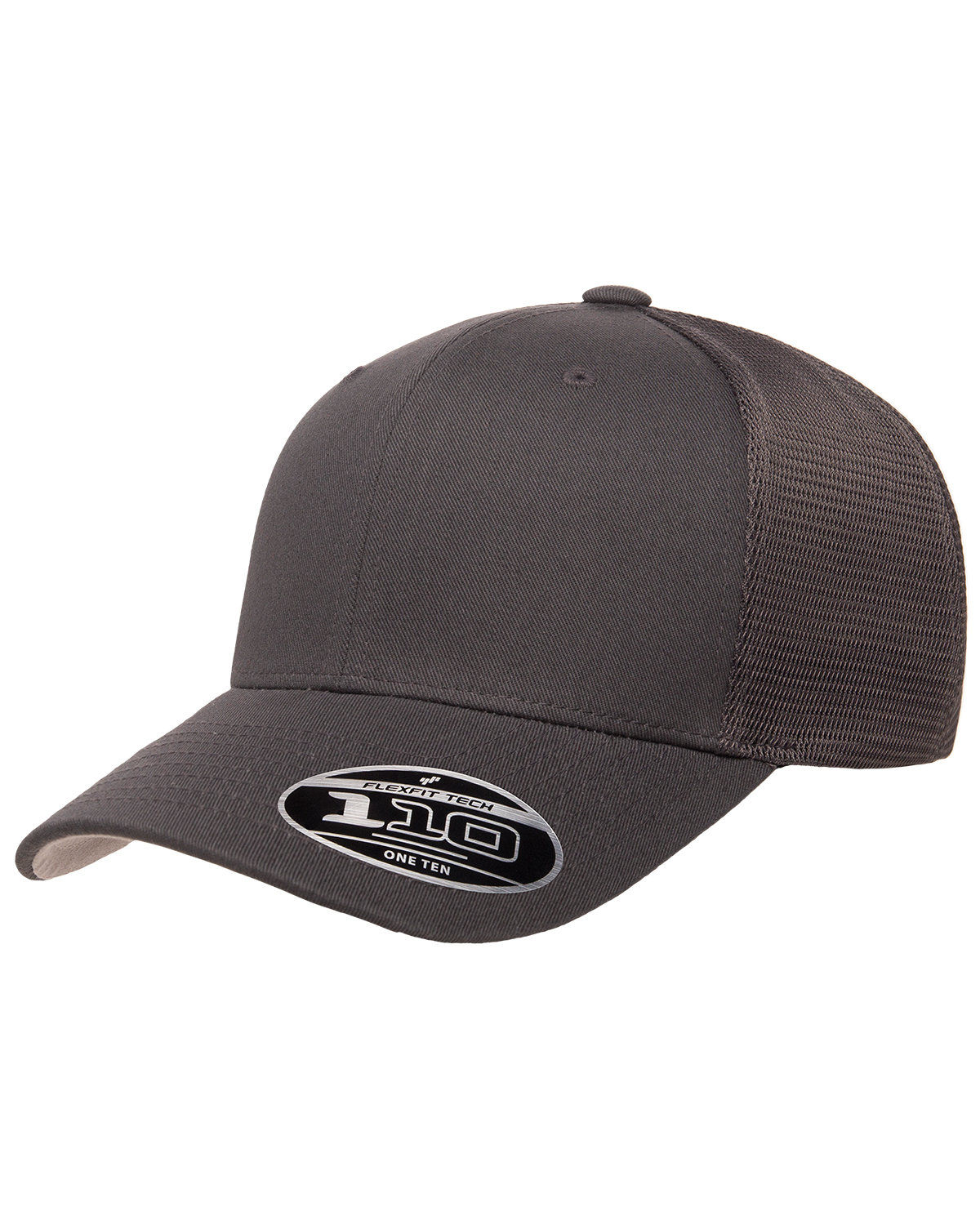 56% polyester, 44% cotton;adjustable + Flexfit® tech = Flexfit 110® cap; mesh cap for utlimate comfort and ventilation; premium Flexfit 110® fabric sweatband; 6-panel, mid profile, structured; plastic snapback closure; permacurv® visor; silver undervisor, 8-row stitching on visor;