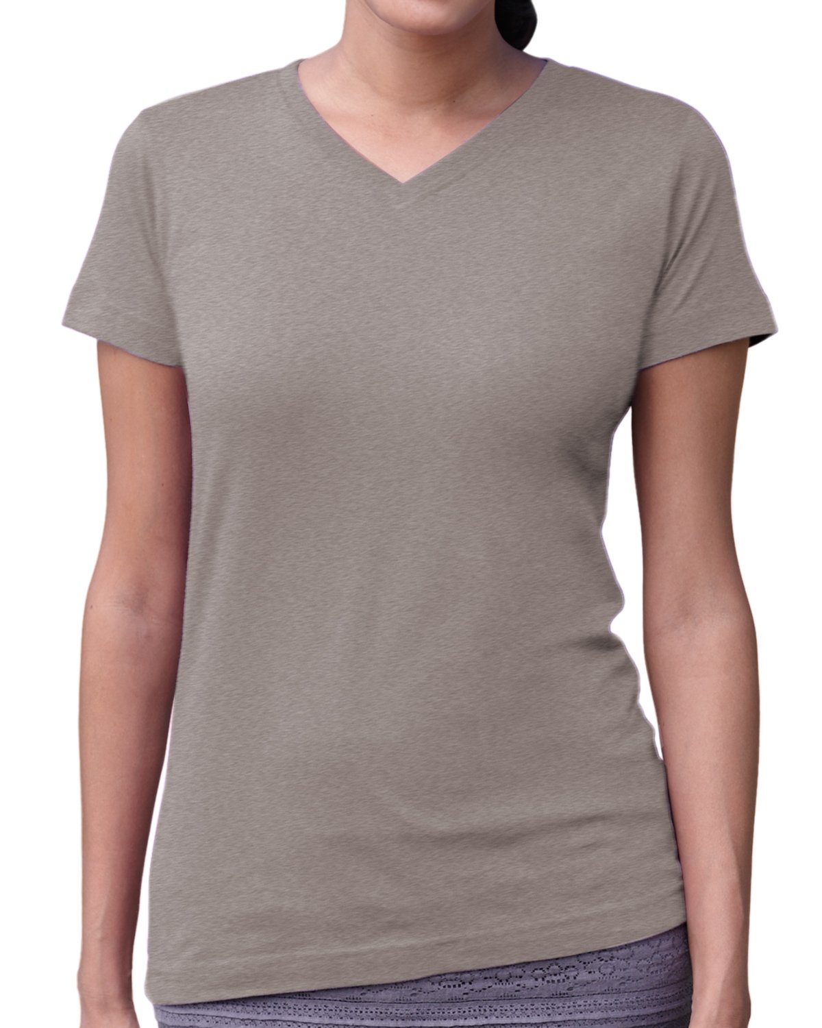 4.5 oz., 100% combed ringspun cotton fine jersey ; Ash is 98/2; Heather is 93/7 combed ringspun cotton/polyester; Ash and White are sewn with 100% cotton thread;Topstitched ribbed v-neck collar; Self-fabric back neck tape; Double needle sleeves and bottom hem; Side seam construction; EasyTear™ label; Machine washable/ tumble dry low; Fit: Ladies' Modern - Semi-fitted;