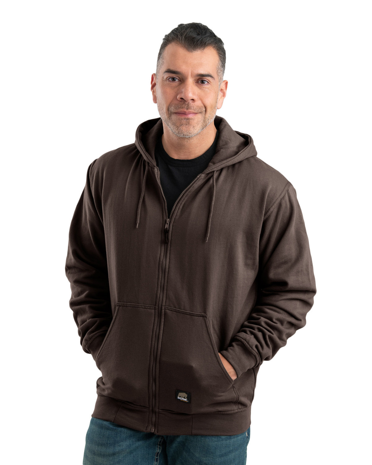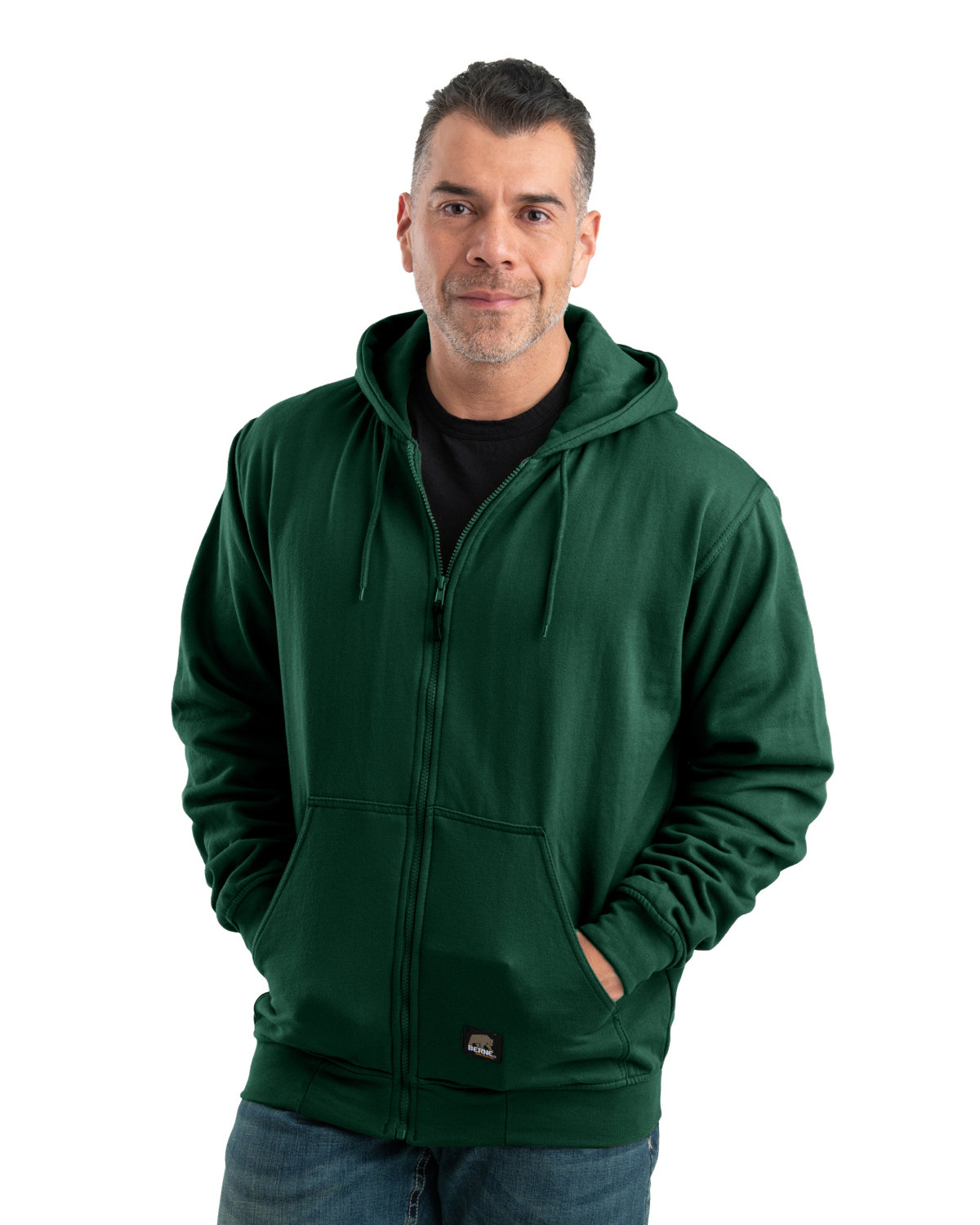 9 oz., 60% cotton/40% polyester fleece; 5 oz., thermal lining;Two-needle stitched main seams; Nylon front zipper; Double layered three-piece hood; Oversized front pockets; Knit cuffs and waistband; Reinforced bartacks at stress points;