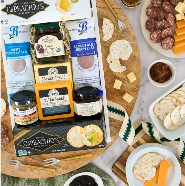 Introducing our Artisan Meat and Cheese Platter- a flavor-packed curated assortment of gourmet treats. This delightful gift basket is your all-occasion gift ticket to gourmet bliss, whether it's birthdays, holidays, or a big heartfelt thank you. Dive into the delicious duo of cheeses, enjoy savory sausage, and spread the love with perfectly paired crackers and hot pepper jelly that will make your taste buds dance. The raspberry honey mustard adds the perfect sweet kick to the other gourmet goodies. Send friends and family a celebration of good times and great flavors. Go ahead, share the joy!
