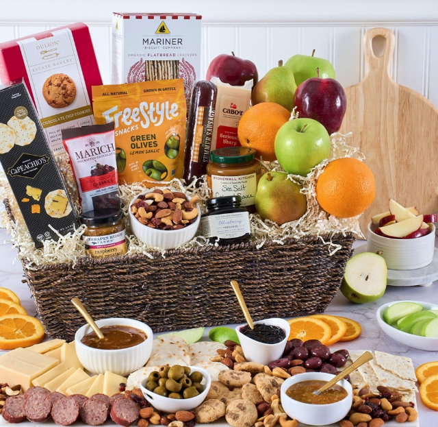 Easily one of our most popular arrangements, this exquisite gift is sure to impress. Inside a beautiful two-handled seagrass basket, your recipient will discover a stunning arrangement of freshly harvested orchard fruits, including crisp apples, juicy oranges, and sweet pears, nestled amongst coveted gourmet foods. Complete with irresistible snacks, like classic farmhouse cheddar cheese, cookies, gourmet jam, and sea salt caramel sauce. This generous gift is perfect for any occasion!