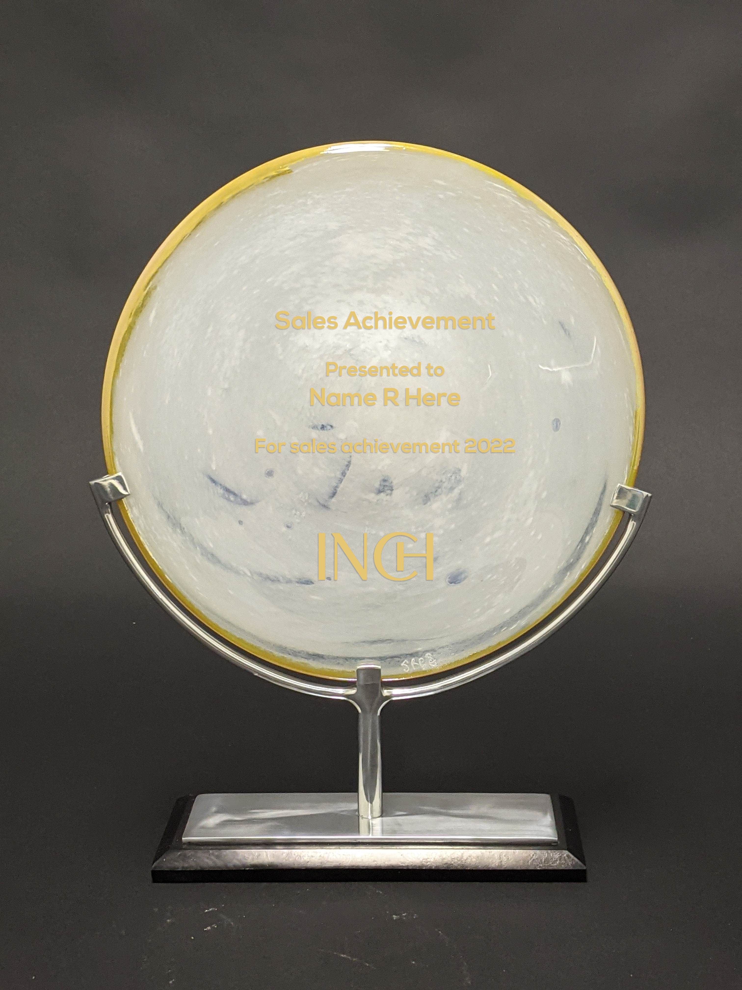 Hand blown glass round etched with information you customize below. Stainless Steel and granite base. Measures 19" tall.