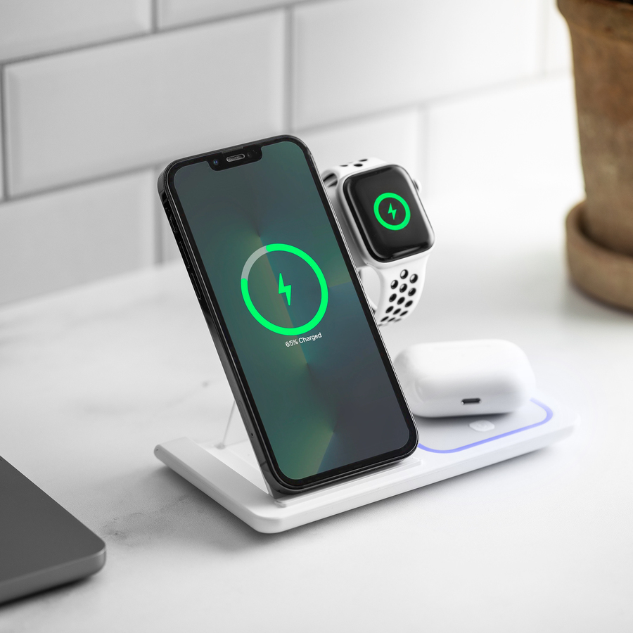 Experience the convenience of the LED Wireless Recharging Station! Designed around a blazing fast 15 watt Qi charging phone stand that features our brand, this item also includes a built in Apple Watch charger, a charging station for any Qi earbuds and a LED light. Truly an all-in-one design that makes the perfect gift. Packaged in a white tuck box (6.75"H x 7"W x 6/8"D). Prop 65 certified.