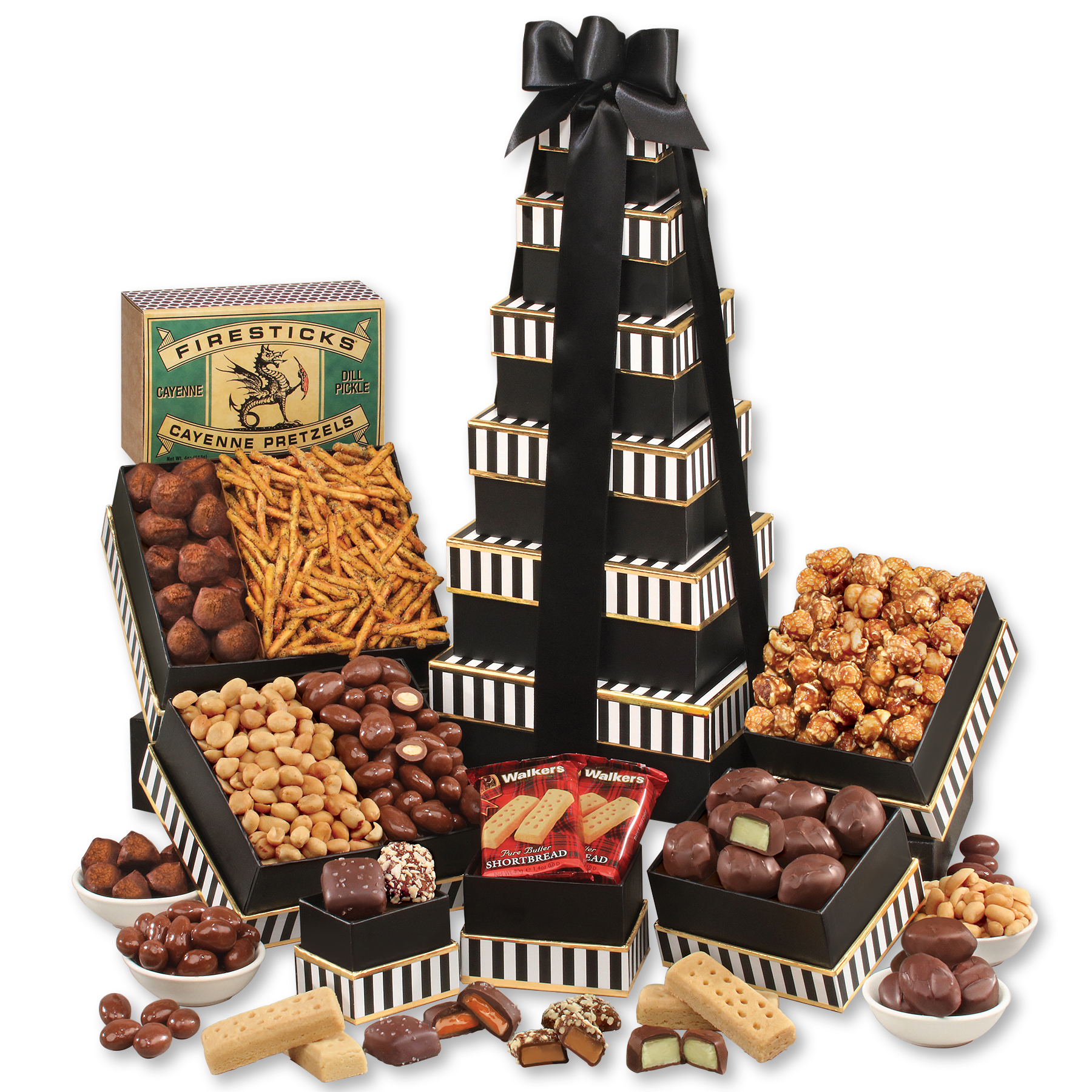 This classic tower contains treats to tease every taste bud! Six boxes are filled with an amazing variety of options, including smooth chocolates, crunchy nuts, sweet popcorn, and more. We stack the boxes high and tie them together with ribbon foil-stamped with your logo in gold. This gift is an unmistakable representation of your appreciation!