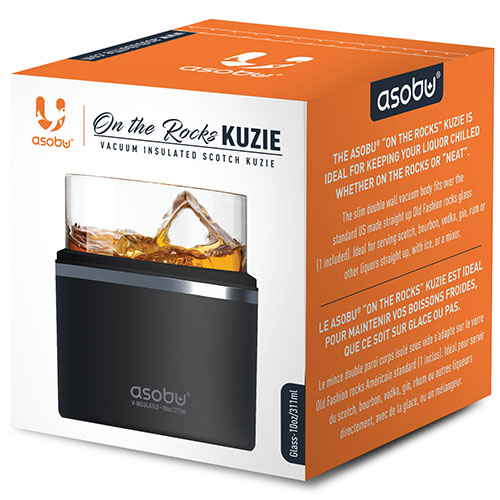 The Asobu® Insulated “On the Rocks” Kuzie is ideal for keeping your liquor chilled whether on the rocks or “neat”. The slim double wall vacuum Asobu® Insulated “On the Rocks” Kuzie fits over the standard US made straight up Old Fashion rocks glass (1 included). It will keep your drink chilled, and is ideal for serving scotch, bourbon, vodka, gin, rum or other liquors straight up, with ice, or a mixer. Chill out with a nice hard drink that will remain chilled. Whether indoors or outdoors, enjoy the great taste of your favourite “on the rocks” liquor served perfectly chilled with the Asobu® Insulated “On the Rocks” Kuzie!