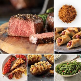 The Best of the Land and Sea! Package includes: 2 Gourmet Franks in a Blanket (11.5 oz pkgs.), 4 Butcher's Cut Filet Mignons (6 oz.), 4 Lobster Tail Skewers (7 oz. pkg.), 4 Stuffed Baked Potatoes (5.5 oz.), 2 Green Beans in Butter Sauce (6.5 oz. trays) & Signature Seasoning (1 oz.).