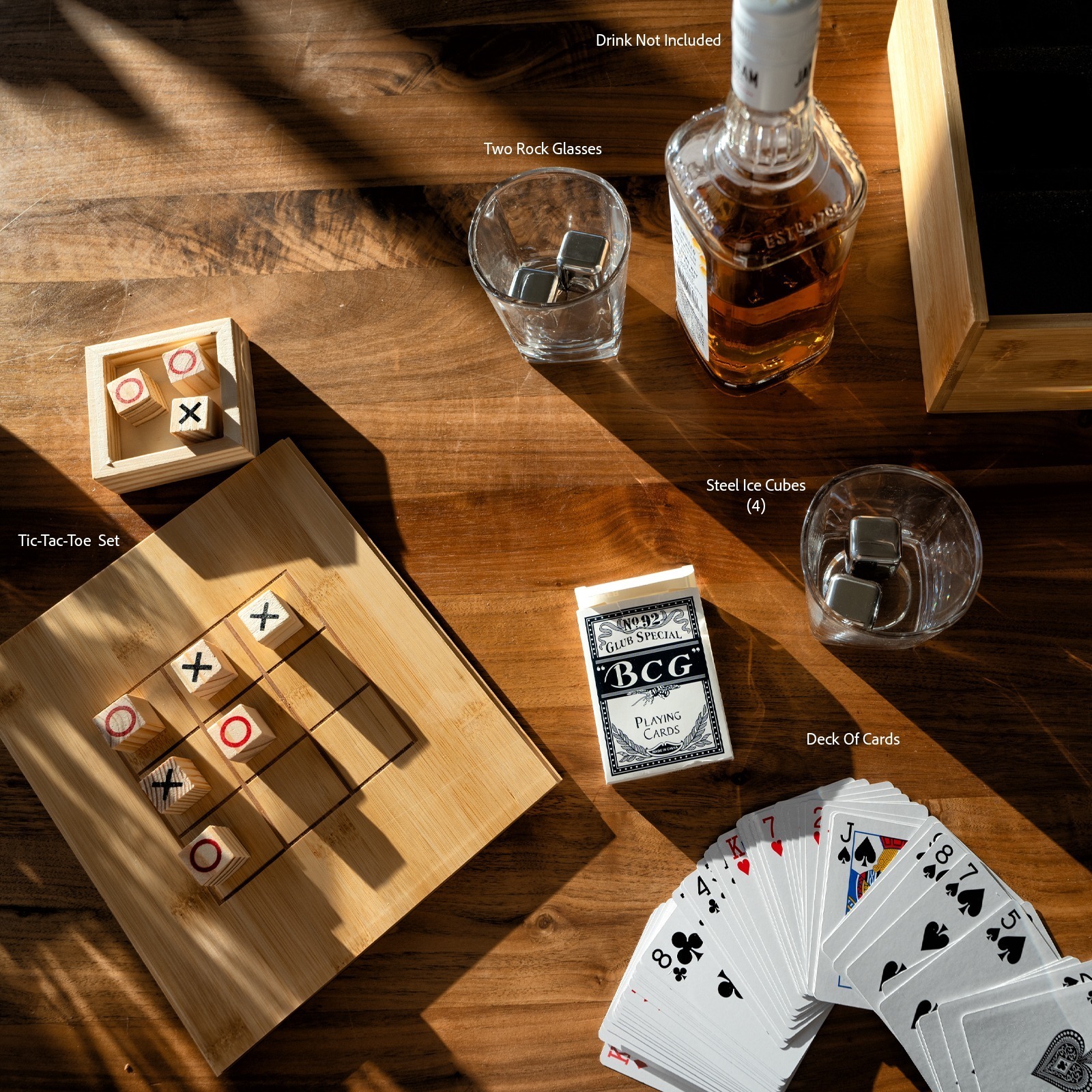 Introducing the Game Night Gift Set, the perfect companion for your next gathering! This thoughtfully curated set includes a deck of playing cards, two rock glasses, and four stainless steel ice cubes, all elegantly packaged in a bamboo gift box. The bamboo box features a slide-off top that reveals tic-tac-toe squares on the reverse side, adding an extra layer of fun to your game night.