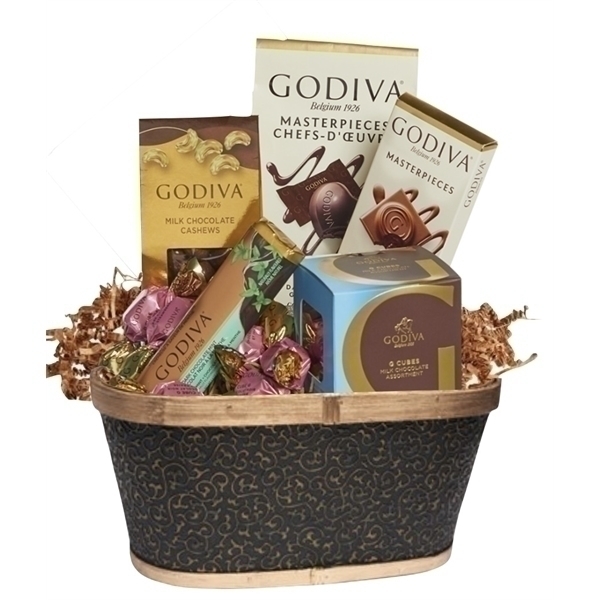 Godiva's best chocolate all in one fabulous gift basket. Includes Godiva chocolate bars, Godiva Truffles, and Godiva chocolate covered cashews. Each basket is wrapped in cello and tied with bow for gift giving presentation. 9 inch basket.