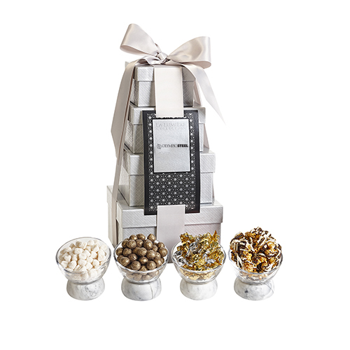 This 4 Tier Tower includes Champagne Bubbles® (4.5 oz), Sparkling Prosecco Cordials (8.5 oz), Gold & Silver Mini Foiled Truffles (36 pcs), and Gold Sparkle White & Dark Chocolate Swirl Popcorn (8 oz).