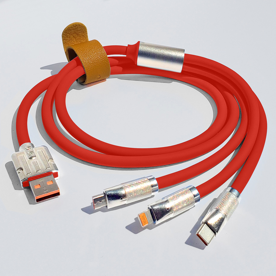 Three interchangeable charging tips that are compatible with any phone, this cable ensures convenient charging for everyone. Its heavy-duty design guarantees long-lasting durability, capable of withstanding the demands of daily use. Crafted from a soft yet resilient material, it offers both flexibility and strength. Heavy duty tangle free cable