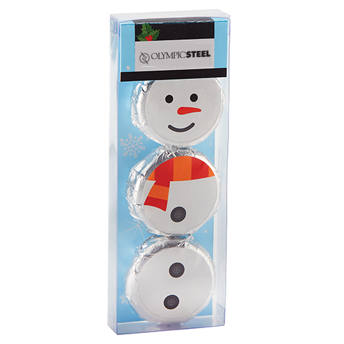 Includes three delicious Belgian Chocolate covered Oreos, packaged as a snowman and features our brand.