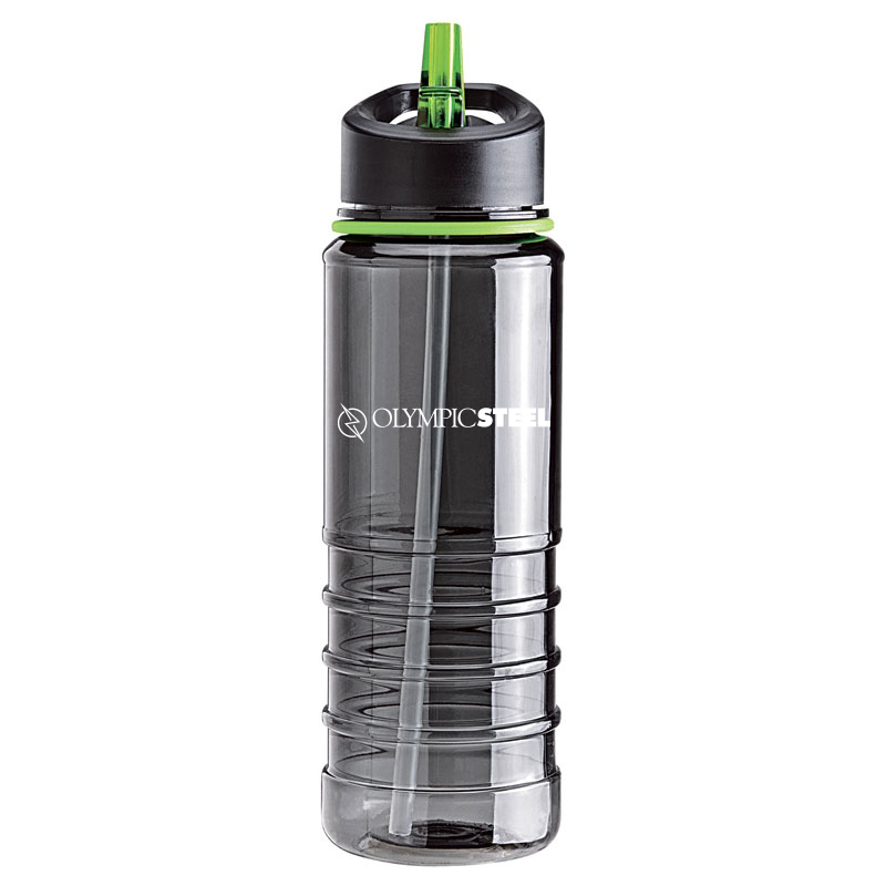 This BPA-Free Tritan bottle has a smoky body, matching color band, ribbed grip area, flip drinking spout, straw and handle.
