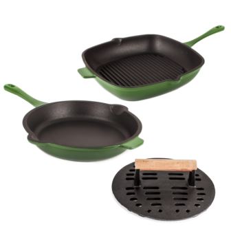 BergHoff - Neo 3pc Enamel on Cast Iron Cookware Set: 10" Fry Pan, Grill Pan and Slotted Steak Press, Green