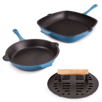 BergHoff - Neo 3pc Enamel on Cast Iron Cookware Set: 10" Fry Pan, Grill Pan and Slotted Steak Press, Blue