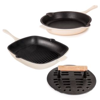 BergHoff - Neo 3pc Enamel on Cast Iron Cookware Set: 10" Fry Pan, Grill Pan and Slotted Steak Press, Meringue