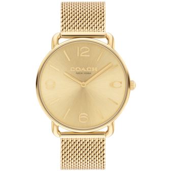 Coach Elliot Gents. 41mm Gold Plated Case. Gold Sunray dial detailed detailed with a mix of numerical and stick makers and the Coach Signature marker at 3 o'clock. Gold Plated Mesh bracelet with sliding buckle. Mineral crystal. Quartz movement. Water Resistant to 99 feet.