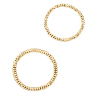 Who doesn't love a set? The Natalia Bracelet Set comes complete with two gold beaded bracelets that you're sure to wear every single day. Each bead is in a sleek disc shape, making this silhouette that much more modern. One is slightly larger than the other, offering interesting dimension. Stack them together or split them apart - the choice is entirely yours. This set includes two BaubleBar elastic bracelets with a gold-tone finish. Each bracelet is crafted from brass. The diameter measures 2.75 in.