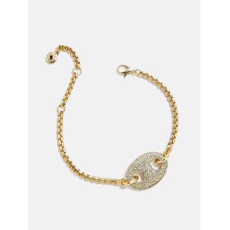 Switch up your bracelets to match your outfits. This mariner link bracelet is reversible - one side is in classic gold, and the other is in glittery pavé. Perfect for day-to-night transitions, it's an effortless staple piece to suit your different style moods. Materials: Glass stones. Gold plated brass. Closure: Lobster Clasp. Allergy Information: Hypoallergenic. Measurements: Length: 7"; 2" extender. Pendant Length: 1". Pendant Width: 0.7".