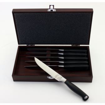 Set Includes: 6 (4.75") steak knives, with a wooden case. Made from high quality Chrome-Molybdenum-Vanadium steel, the forged bolster is featured for added weight, perfect balance, and increased safety. The handles are state of the art nick-resistant, ergonomically molded poly-oxyethylene, a material often used as a direct replacement for metals.