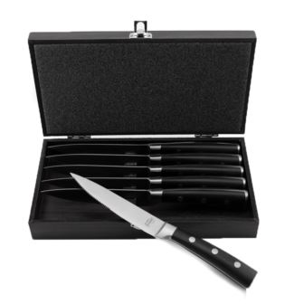 Set Includes: 6 pc knife set, wooden case for storage. Everyone needs a great knife set! Durable high-quality stainless steel is absolutely indestructible and corrosion resistant. The highly polished surface is hard wearing, thick, easy to clean and hygienic. Advanced manufacturing methods plus traditional craftsmanship guarantee flawless product quality.