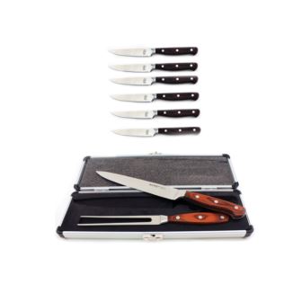Serve up steak for the whole family with this six-piece steak knife set. Accompanying 6" carving fork and 8" carving knife (with 14" x 4" aluminum storage case) make carving a ham, turkey or roast easy! Each knife features a stainless-steel blade with unibody design, riveted tang and precision-sharpened edge. From rare to well done, these knives will slice right through with ease. Ergonomic handle design gives you total cutting control.