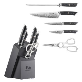 Stunning to look at and a revelation to use, this impeccably crafted knife set eases any cutting task. An impressive 67 layers of steel swirl the Damascus cladding, creating enduring blades reinforced with a proprietary heat treatment. Skilled artisans sharpen the full-tang knives by hand to an extraordinary serrated edge. The black and grey faux wood grain handles are each secured with a single mosaic rivet for an ornate finishing touch. Includes paring knife, serrated utility knife, chef's knife, shears and honing steel in a gray-finished wood block.