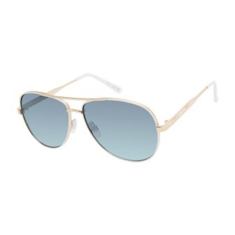 Metal aviator sunglasses are a favorite accessory for all seasons. Gold frames trimmed with white around lens, gold browbar and blue lenses. 100% UV absorptive lenses. Integrated nose pads. Soft microfiber pouch, with a drawstring closure, that can be used as a lens cleaning cloth, and to prevent scratches, keep clean and for safe storage is included.