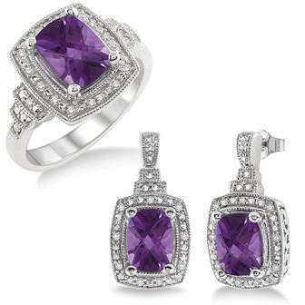 Passionately purple and timelessly elegant. Genuine cushion cut purple amethyst earring and ring set. .20twt round diamonds set in sterling silver. Heavy friction backs for added security. Matches well with necklace JN810.