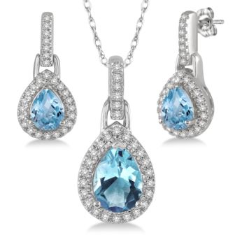 Shimmering 6x4mm and 7x5mm pear-shaped genuine aquamarines are elegantly complemented by 10k white gold surrounded by a stunning halo of .30twt round diamonds. 18" cable chain with a spring ring clasp. Push back earrings.
