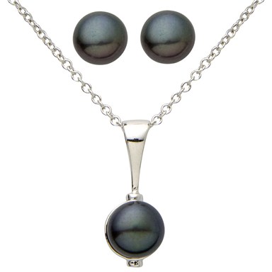 The symbol of purity, prosperity and beauty. Classic 7mm black freshwater button pearl earring and necklace set, sterling silver with an 18" cable chain.