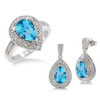 First impression..... is WOW! This beautiful earring and ring set contains genuine pear shaped blue topaz set in sterling silver with .20twt diamond accents. Comfortable and flirty. Matches well with necklace JN811-BT.