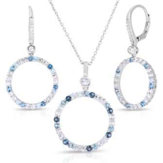 This stunning earrings and pendant set glows in the sunlight and moon light. They are set with shades of genuine blue topaz- London blue, sky blue and Swiss blue. The earrings have .05twt round diamond accents and are pierced only. The necklace has genuine blue topaz and .02twt round diamonds suspended on an 18" cable chain with lobster claw clasp. Sterling Silver.