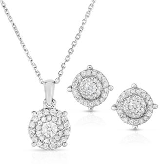 Round brilliant cut diamonds are set in unique multi-stone design made of 14k white gold. They appear nearly three times larger than their actual carat weight. 1.00twt earrings and .50twt necklace.