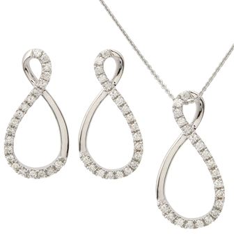 Diamonds descend dramatically before giving up the stage to 10k white gold. Diamond infinity earring and necklace set. .48twt round brilliant cut diamonds. 18" cable chain. 10k white gold.