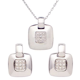 Style is knocking at your door with a geometric spin on the doorknocker classic. Contemporary diamond door knocker earring and necklace set, .03twt round diamonds, sterling silver, 18" cable chain.