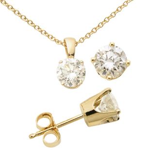 Simple, stunning and dazzling- like you. Classic diamond solitaire earring and necklace set. .48twt round brilliant cut diamonds, 14k yellow gold, heavy friction posts for added security. 18" beautiful cable chain.