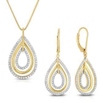 You'll be on fire with these diamond tear drop earring and necklace set. .75twt round diamonds set in sterling silver with yellow gold overlay. Hinged posts for added comfort and 18" box chain.