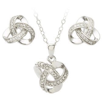 No better way to express your endless love than with these diamond Love Knot earring and necklace set. Classic and beautiful and perfect for every occasion. .03twt round diamonds set in sterling silver, 18" cable chain. Matches well with ring JR848.