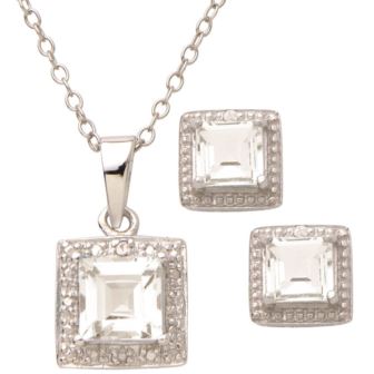 Mesmerizing and magnificent, to name a few. 6mm square white topaz with .03twt round diamond accents earring and necklace set in sterling silver with an 18" cable chain.