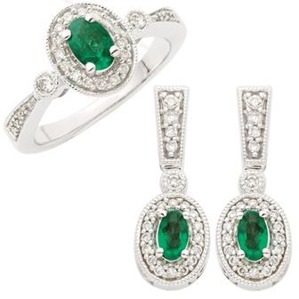 Covet the sacred stone known to preserve love. Beautiful dangle earring and ring set. Genuine oval emeralds set in 14k white or yellow gold with .53twt round diamonds. Matches well with necklace JN425-EM.