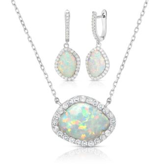 Deco design with a contemporary twist- 12x10mm opal necklace and earrings with white sapphire accents. Sterling silver cable chain with a lobster claw clasp. Clean, modern and perfect in every way.