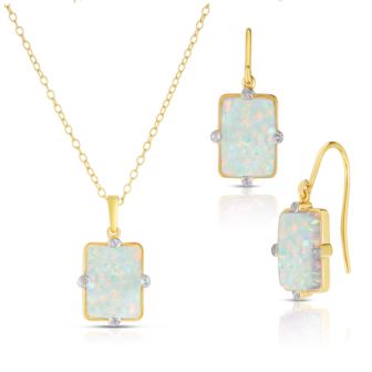 There's much to be admired of these beautifully unique drop earrings and necklace set! Vibrant 12x9mm rectangular opal cabochons are framed by sparkly white topaz accents, all of which are illuminated by lustrous high-shine 14k yellow gold vermeil (sterling silver with 3 micron thick 14k yellow gold plating) to further enhance the wonderful color play of the opals. Pendant is suspended from an 18" cable chain with a spring ring clasp.